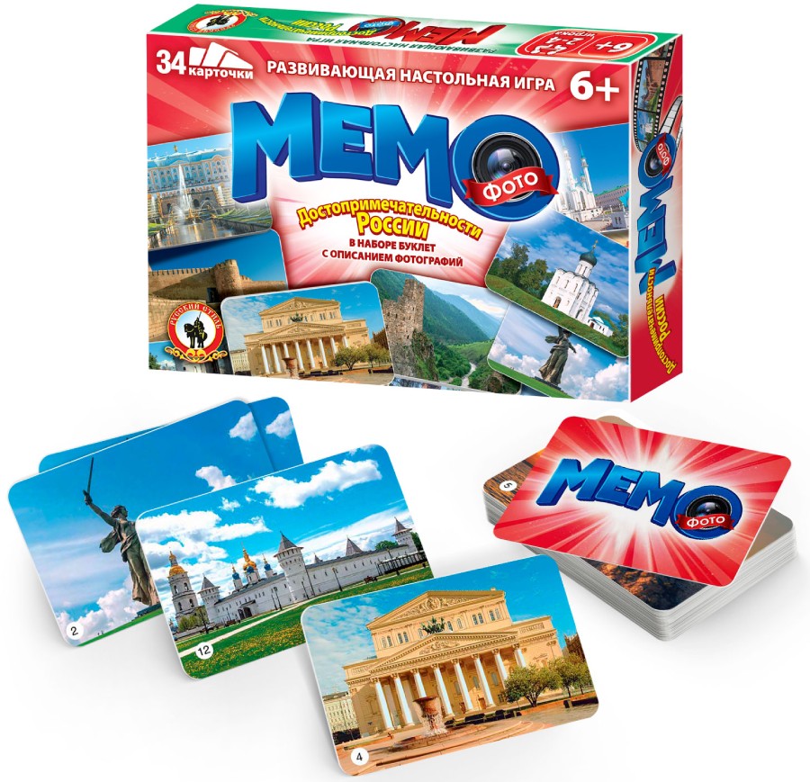Мемо - увлекательная игра для развития памяти и внимания. Карточки выкладываются на столе рядами рубашкой вверх, в свой ход игрокам необходимо открыть две одинаковые карточки. Выигрывает тот, кто наберет больше всего парных карточек. Россия – страна с многовековой историей и богатой культурой, ее просторы поражают воображение. Восхитительные памятники архитектуры и уникальные достопримечательности раскинулись от Балтики до Тихого океана. Некоторые архитектурные и историко-культурные памятники на территории Российской Федерации внесены в список объектов Всемирного Наследия ЮНЕСКО. В этом наборе собраны фотографии самых известных и интересных достопримечательностей нашей страны. В наборе 34 карточки, буклет с описанием фотографий. Для 2-4 игроков. Возраст 6+. Материал: картон, бумага.