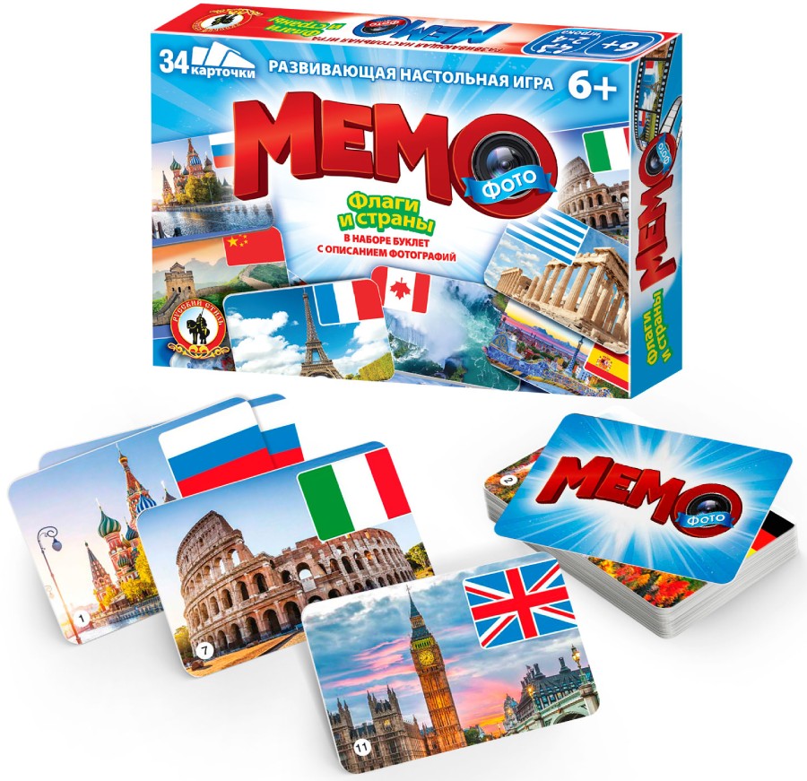 Мемо - увлекательная игра для развития памяти и внимания. Карточки выкладываются на столе рядами рубашкой вверх, в свой ход игрокам необходимо открыть две одинаковые карточки. Выигрывает тот, кто наберет больше всего парных карточек. В мире существует огромное количество разнообразных стран, со своей историей и культурой. Каждая страна имеет свою история возникновения флага. На карточках изображена одна из основных достопримечательностей страны и ее флаг. В буклете краткое описание флага и название столицы. Познакомьтесь с одним из важнейших символов разных стран вместе с нашим мемо! В наборе 34 карточки, буклет с описанием фотографий. Для 2-4 игроков. Возраст 6+. Материал: картон, бумага.