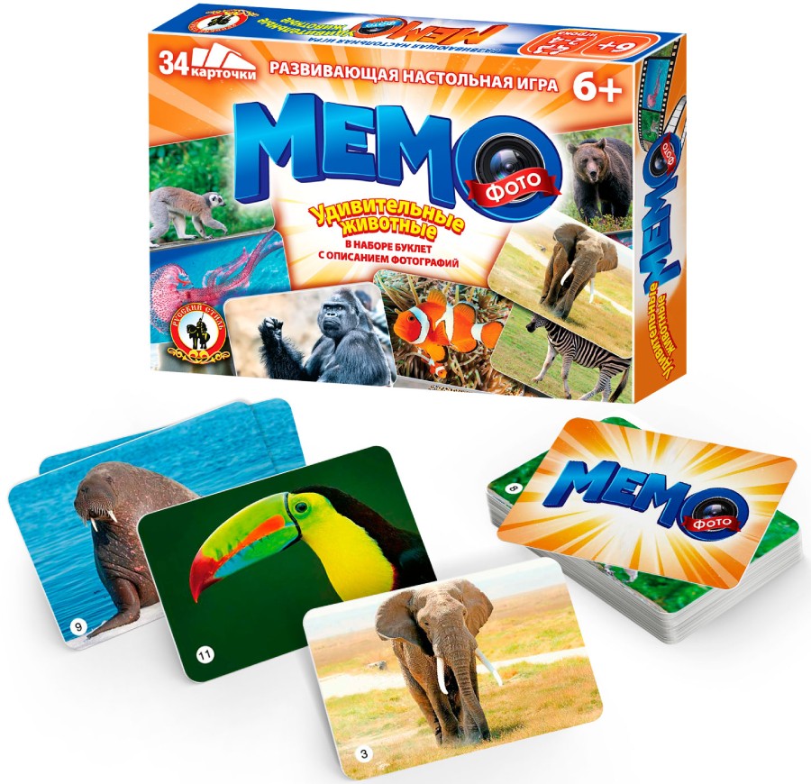 Мемо - увлекательная игра для развития памяти и внимания. Карточки выкладываются на столе рядами рубашкой вверх, в свой ход игрокам необходимо открыть две одинаковые карточки. Выигрывает тот, кто наберет больше всего парных карточек. Сколько удивительных существ обитает на нашей планете! Животный мир очень разнообразен и богат. В настоящее время учёные насчитывают более 1,6 млн. видов разнообразных животных. Удивительные и разнообразные, они поражают человека своей необычностью, красотой и способностью приспосабливаться к жизни. Иногда остается только удивляться, насколько необычные создания существуют на нашей планете. В этом наборе собраны фотографии самых ярких и удивительных животных, обитающих в разных уголках Земли. В наборе 34 карточки, буклет с описанием фотографий. Для 2-4 игроков. Возраст 6+. Материал: картон, бумага.