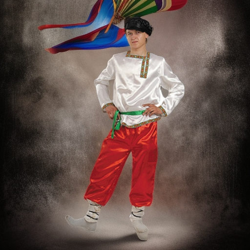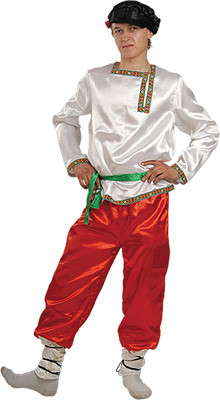 Наряд для взрослого мужчины в классическом русском стиле Ванюша № 16320-1 состоит из рубахи-косоворотки с народной вышивкой, красных шаровар и лаптей. На голову надевается черный картуз, который можно украсить искусственным цветком. Костюм подойдет для выступлений в ансамбле песни и пляски или для спектакля по мотивам русской народной сказки. Изделие отличается простотой в уходе и качественной обработкой швов. Лапти можно заменить классическими высокими сапогами. Изделие подойдет тем, кто любит русские народные песни и танцы.