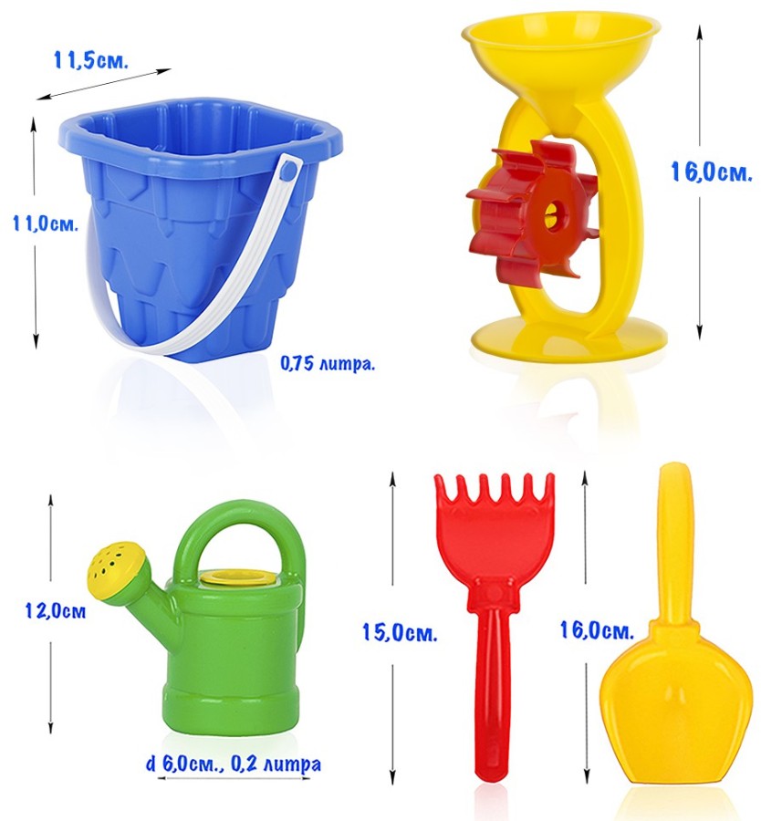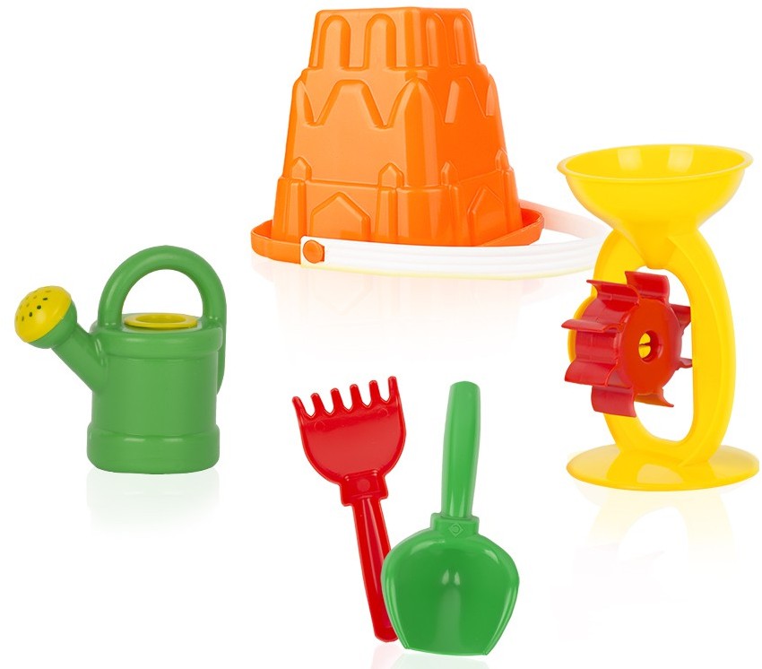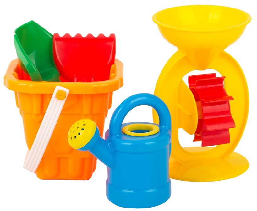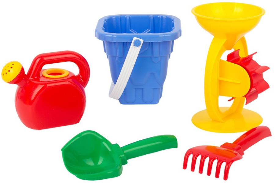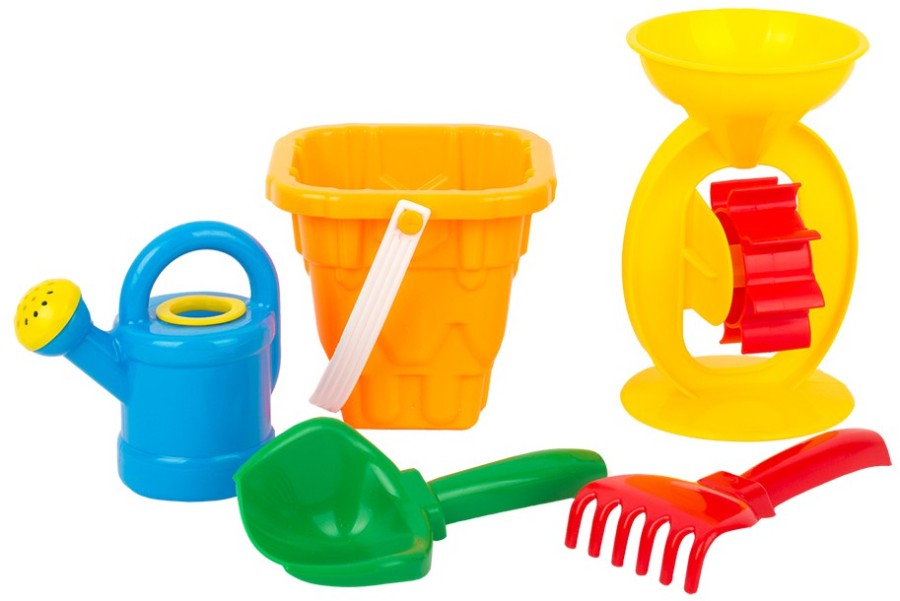 Состав: ведро Башня, мельница, лейка-мини, совок, грабли. Набор предназначен для игр на улице и дома.Благодаря играм с сыпучими материалами малыш будет развивать воображение, мелкую моторику рук и координацию движений, знакомиться с окружающим миром. Игрушка изготовлена из высококачественных материалов. Изделие проверено на соответствие требованиям технических регламентов Таможенного Союза и имеет сертификацию ЕАС