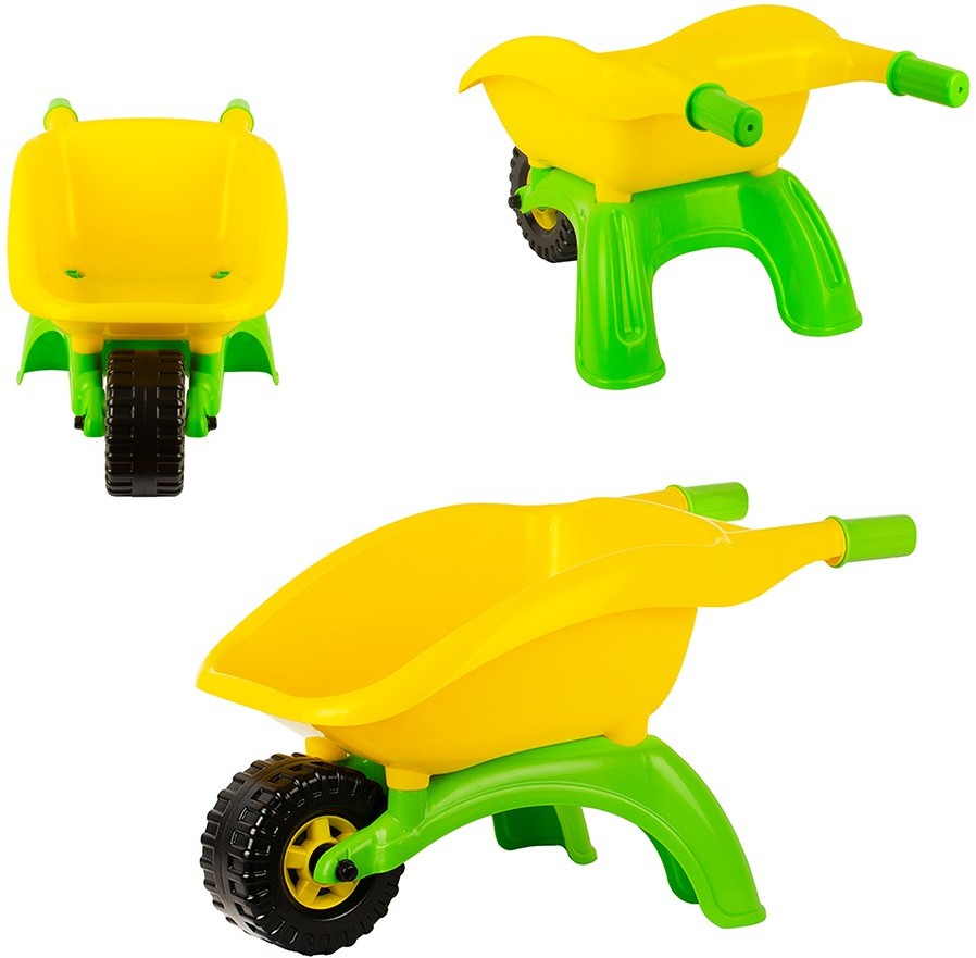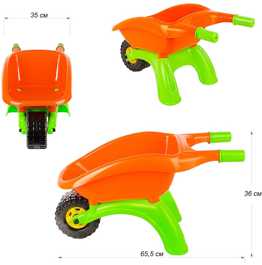 Прочная конструкция оснащена ручками и одним колесом для транспортировки тележки. Игрушка предназначена для игр на улице. Развивает физическую форму, социальные навыки и приучает к труду. Игрушка изготовлена из высококачественных материалов. Изделие проверено на соответствие требованиям технических регламентов Таможенного Союза и имеет сертификацию ЕАС