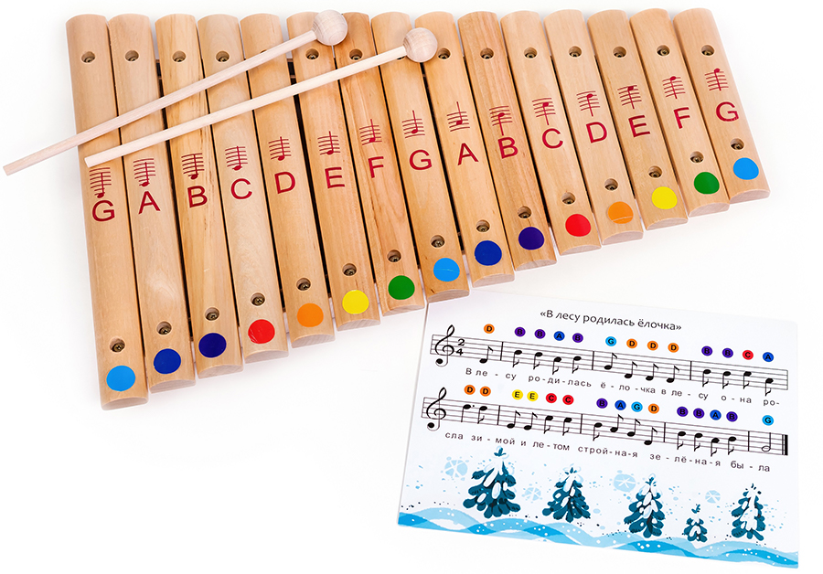 Ксилофон 15 тонов - ударный деревянный музыкальный инструмент с деревянными планками, разными по величине и настроенными на определенные ноты. По планкам ударяют палочками с шарообразными наконечниками. Ударяя палочками по планкам, ребенок учится создавать различные мелодии. Звук приятный, средней громкости. Эта музыкальная игрушка подходит для детей любого возраста. Малыши еще до года очень любят стучать всяческими палочками и молоточками по разным предметам, а тут они могут тренироваться в попадании палочками по пластинкам ксилофона и слушать результат. Малыши старше двух лет уже могут сами сочинять мелодии, совершенствуя музыкальную память и раскрывая музыкальный талант. Игра на ксилофоне способствует развитию у детей музыкального слуха, учит улавливать ритм и запоминать мелодии и звуки, совершенствует координацию движений руки.