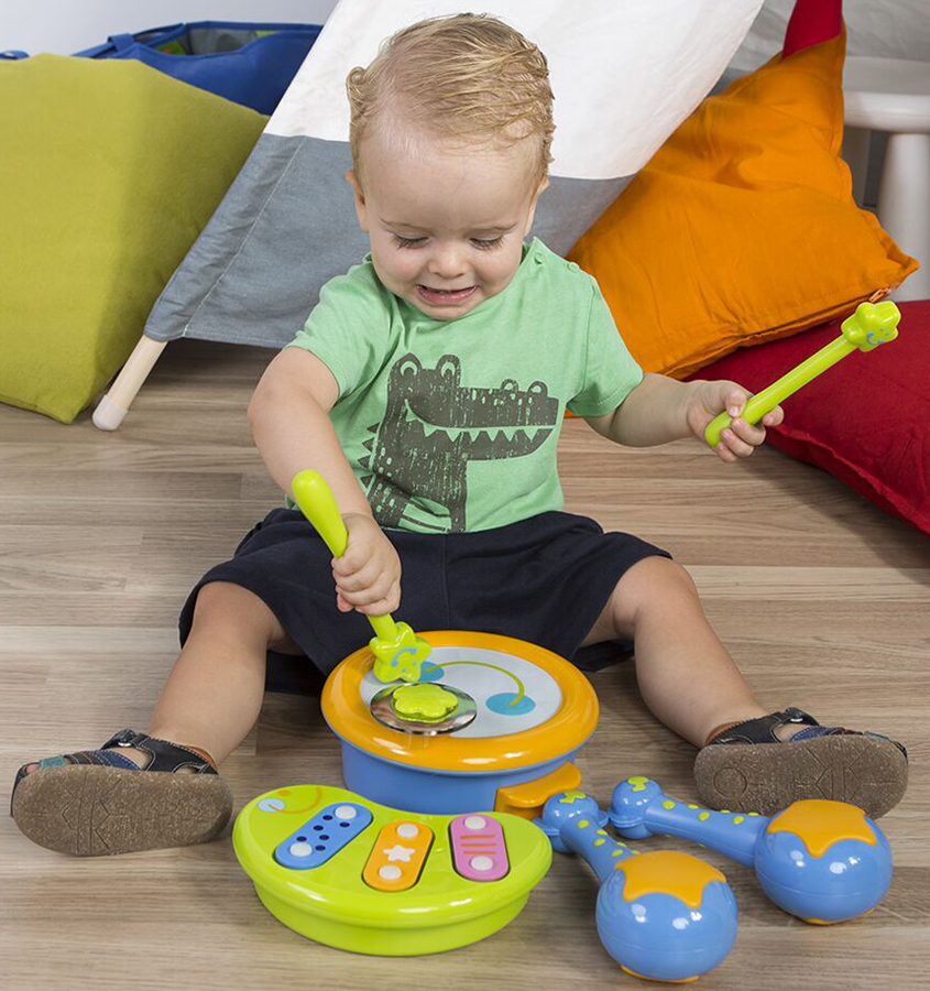 Фантастический и надежный набор инструментов, чтобы начать свое путешествие в мир перкуссии. Барабанные палочки можно хранить, прикрепив их к ручкам барабана. Диаметр барабана 18 см. В комплекте 1 барабан с тарелкой, 2 барабанные палочки, 1 ксилофон и 2 маракаса