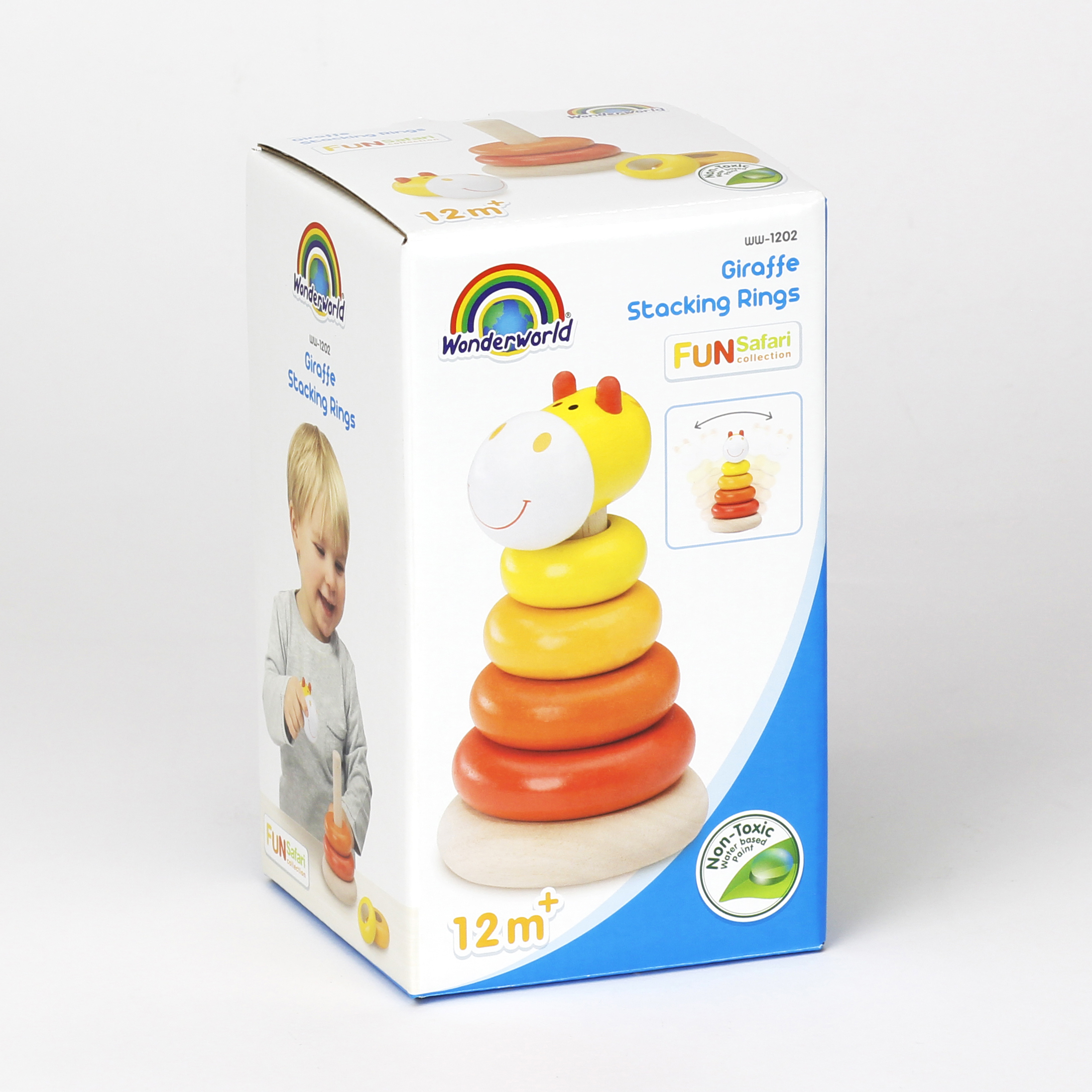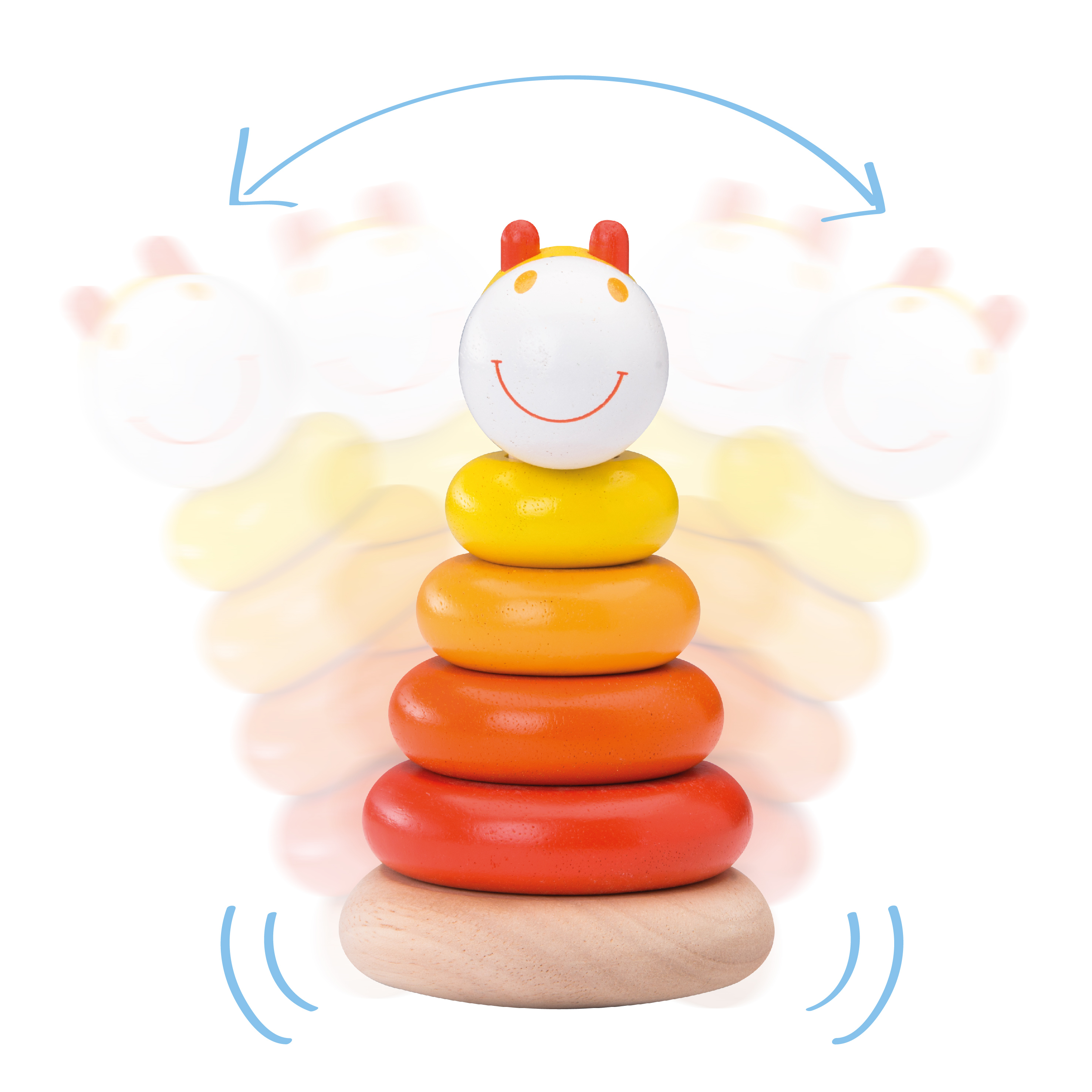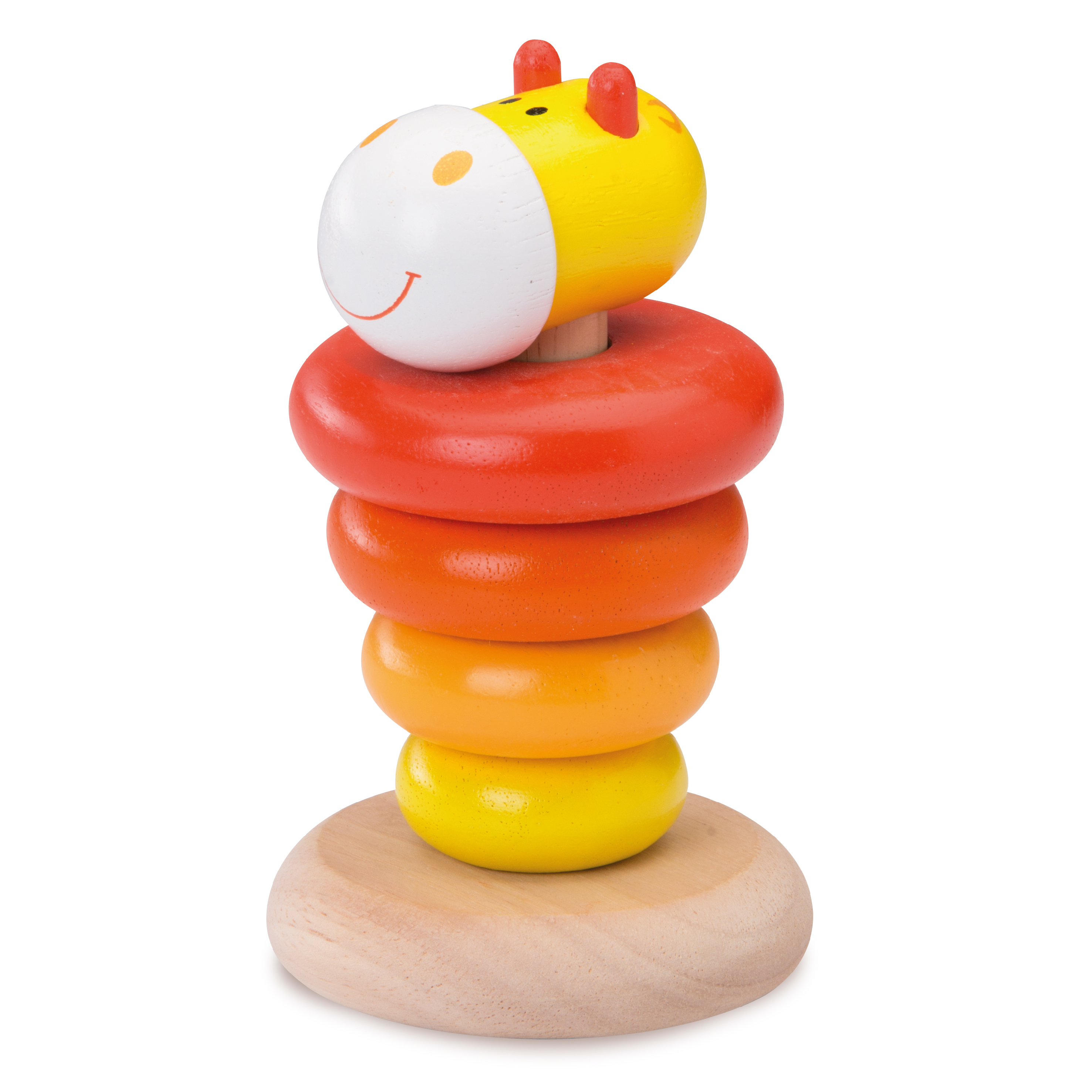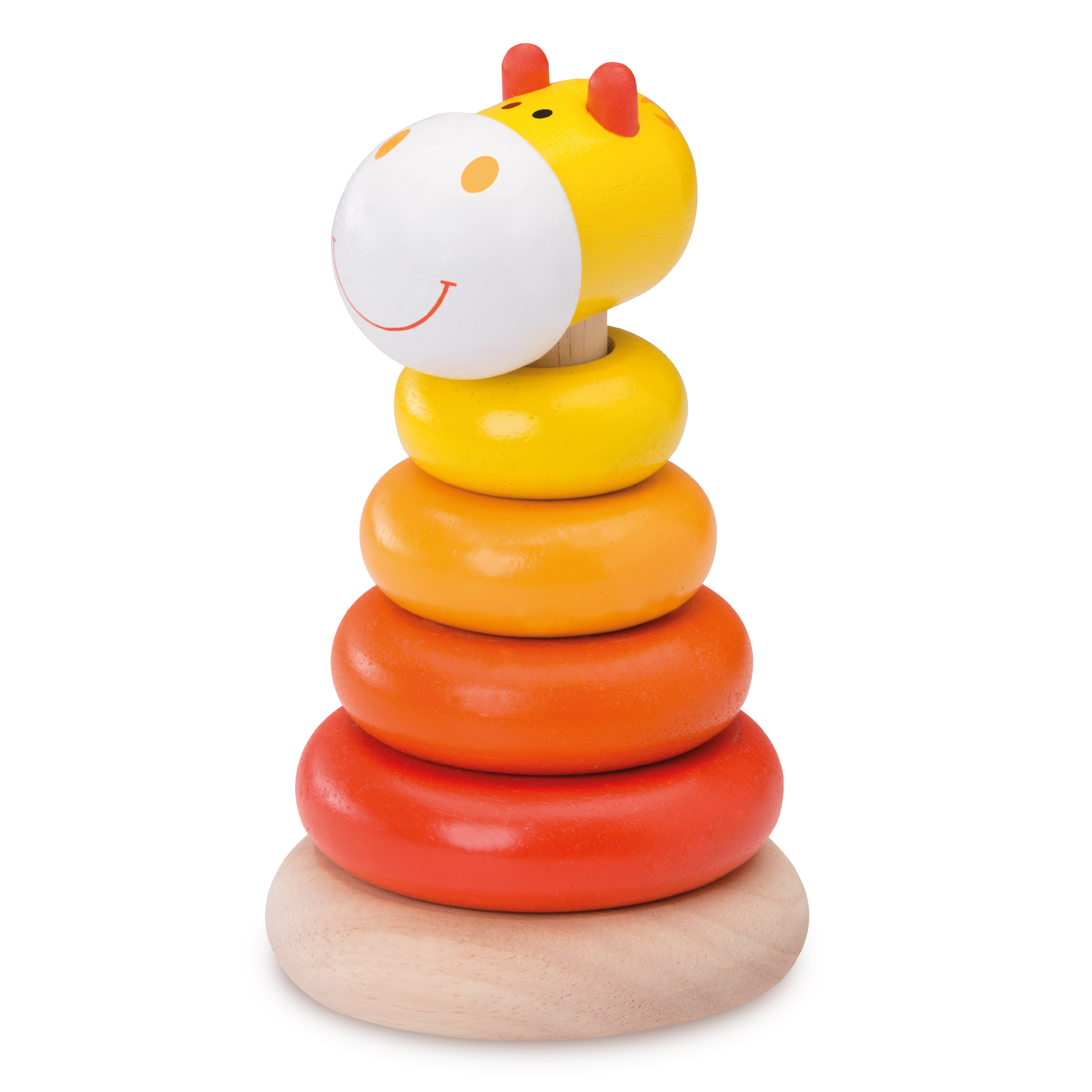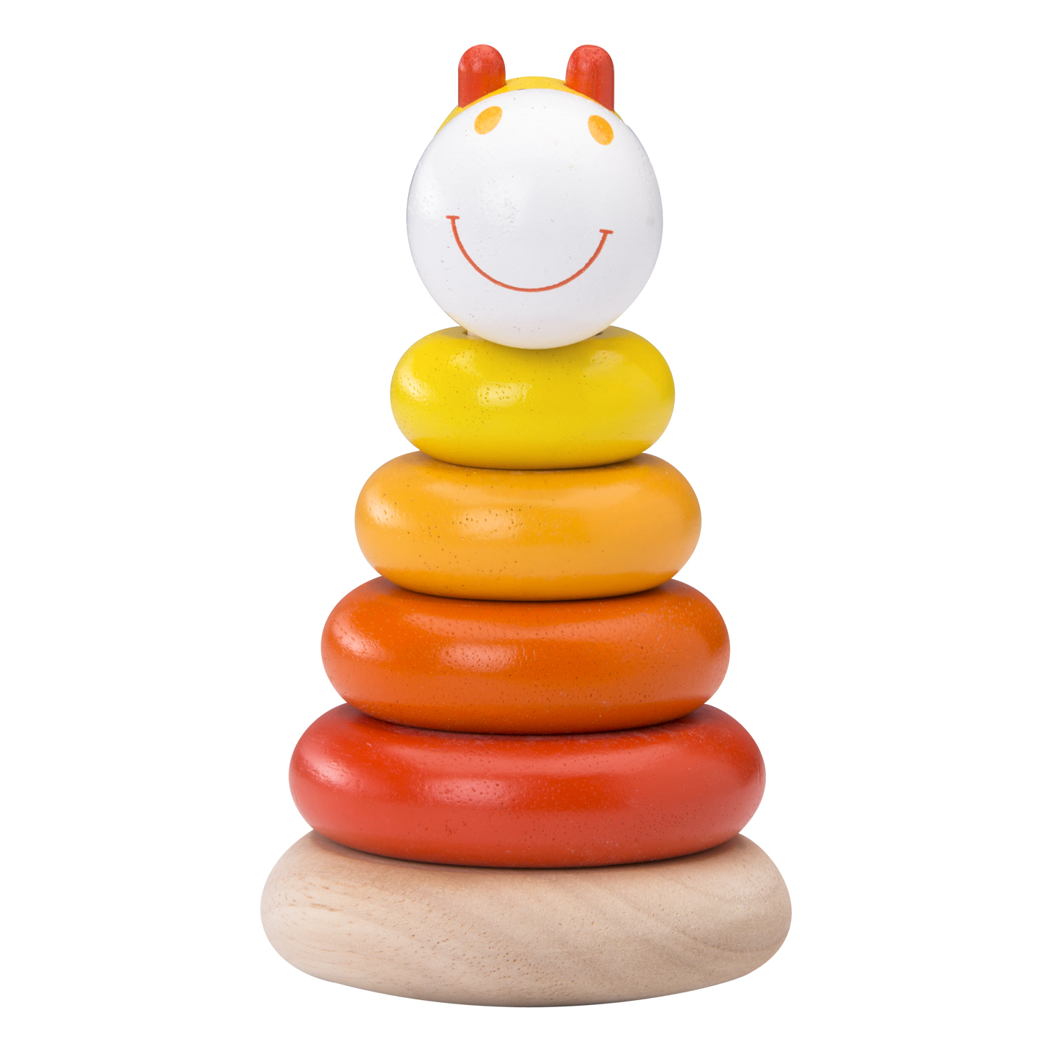 Пирамида-неваляшка с 5 кольцами разных размеров в цветах сафари. Верхушка в виде веселой мордочки жирафа. Основание пирамиды закругленной формы для неваляшки.