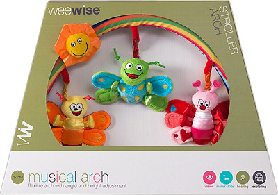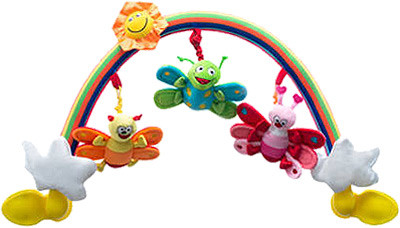 Гибкая и мягкая дуга-арка БАБОЧКИ с забавными игрушками-насекомыми. Дугу можно разместить на детской прогулочной коляске или автокресле, угол ее наклона и, соответственно, высота игрушек могут регулироваться.