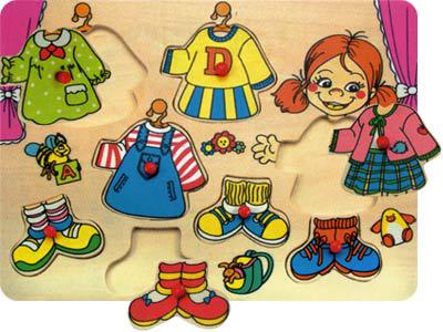 Развивающая игра – собирая рамку-вкладыш, ребенок подбирает одежду для модницы Каролины. У нее 4 комплекта верхней одежды и 4 пары обуви. Всего вынимается 8 деталей.
