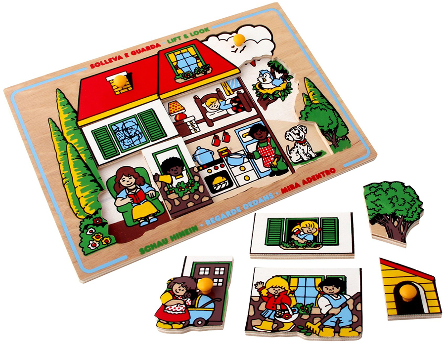 Мозаика "Дом большой" состоит из деревянного планшета размером 29,5х20 см, изображающего внутренний вид дома «в разрезе», и 10 вкладышей, собирающихся в верхнюю картинку – «дом снаружи». Часть вкладышей снабжена для удобства ручками-кнопочками. Изображение окон в доме служит своеобразной подсказкой при сборке головоломки: по окну можно догадаться, какую часть фасада подбирать. Собирая мозаику, ребенок знакомится с обитателями дома, их основными занятиями. Придумайте вместе с малышом историю о ребятах, изображенных на планшете, дайте каждому герою имя. Пособие-головоломка из серии «Снаружи и внутри» состоит из планшета размером 29,5х20 см, изображающего внутренний вид дома «в разрезе», и 10 вкладышей, собирающихся в верхнюю картинку – «дом снаружи». Часть вкладышей снабжена для удобства ручками-кнопочками. Изображение окон в доме служит своеобразной подсказкой при сборке головоломки: по окну можно догадаться, какую часть фасада подбирать. Пособие предназначено для детей 3-6 лет и способствует развитию мелкой моторики, логического мышления, внимания, формирует пространственные ориентировки, способствует закреплению понятий «наверху – внизу», «слева – справа», «рядом», «над – под», «около». Данное пособие входит в серию головоломок «Снаружи и внутри». Мозаика "Дом большой" способствует развитию у детей мелкой моторики, логического мышления, внимания. Головоломка формирует пространственные ориентировки ребенка, способствует закреплению понятий «наверху – внизу», «слева – справа», «рядом», «над – под», «около».
