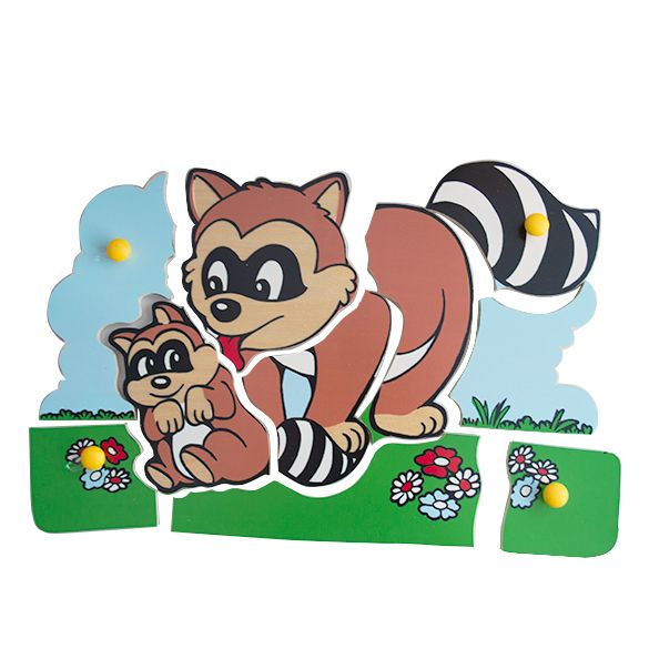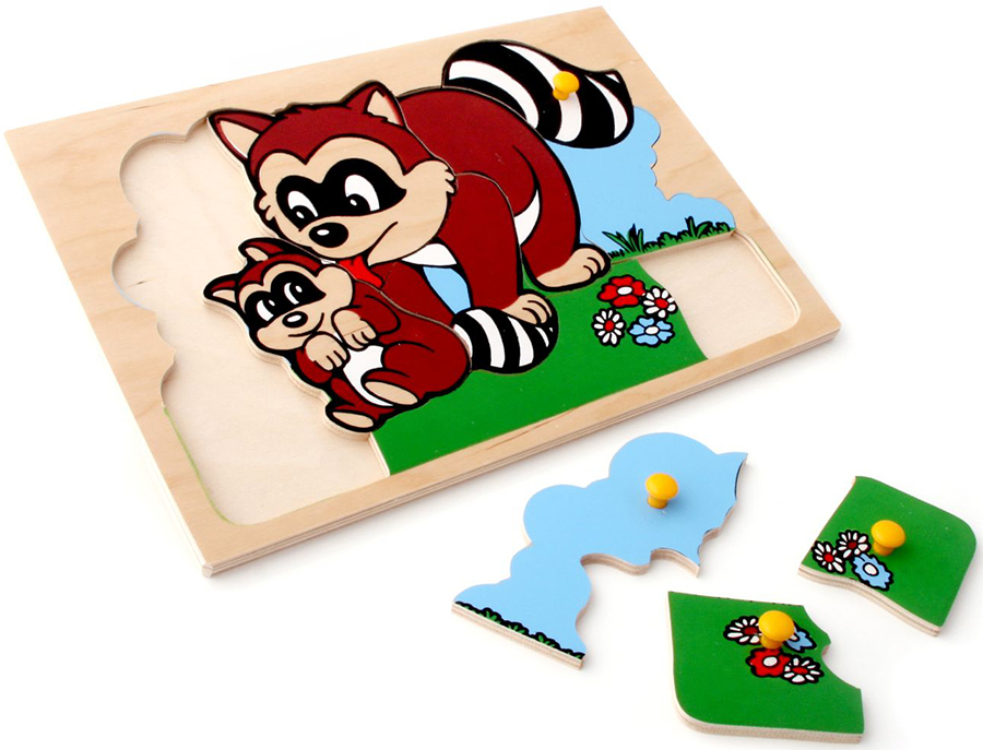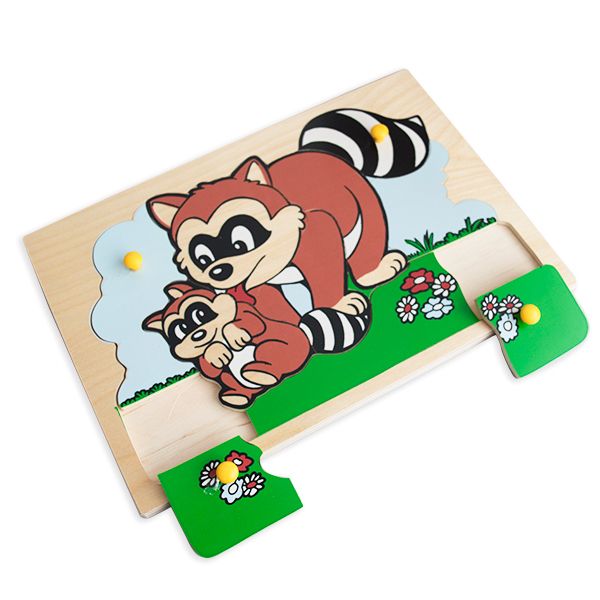 Вкладыш-головоломка размером 29,5х20,5 см, на котором изображен енот с детенышем. На вкладышах головоломки имеются ручки-кнопочки. Открыв эти элементы, ребёнок должен их закрыть, подобрав нужную по размеру и рисунку часть. Предназначены пособия для детей от 2 до 6 лет. Кроме развития мелкой моторики и координации движений, игра формирует пространственные представления: “снизу”, “сверху”, “сбоку”, “справа”, “слева”, а также логико-математические: “больше”, “меньше”, “столько же”, “поровну”, “выше”, “ниже” и т.д.