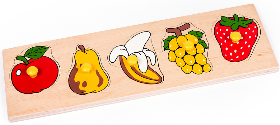 Рамка-вкладыш "Фрукты" представляет собой деревянную панель и 5 разных картинок, на которых изображены фрукты (яблоко, груша, банан...), каждая из которых снабжена удобной ручкой. Пособие предназначено для детей от 1 года до 5 лет. Играть с данной игрушкой очень просто: покажите малышу доску с уложенными вкладками, затем достаньте их и предложите ему вложить каждую вкладку на то место, которое соответствует цветной картинке. Играя, ребенок учится классифицировать предметы по разным принципам, учится находить различия и что-то общее в предметах, рассказывать и спрашивать. Постепенно вы можете усложнять задания, предлагая сосчитать или описать картинки. Пособие развивает и тренирует у детей мелкую моторику, внимание, формирует элементарные счетные умения и пространственные ориентировки (слева, справа, в центре).