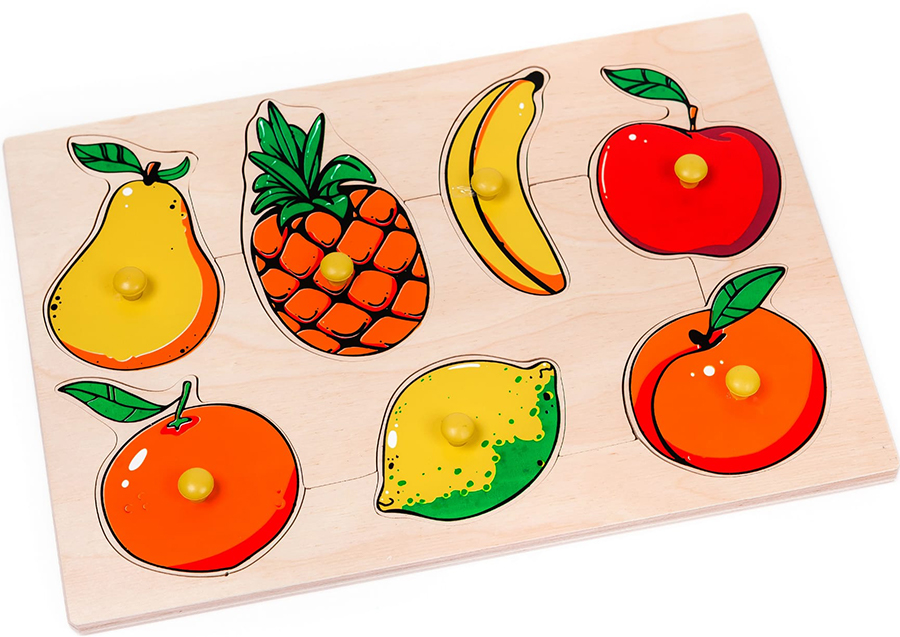 Пособие представляет собой деревянный планшет, на котором размещено 8 фруктов. Для удобства вкладыши-фрукты снабжены ручками-кнопками.