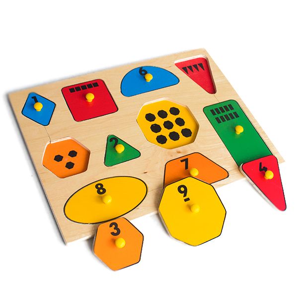 Вкладыш "Геометрические фигуры" представляет собой деревянный планшет размером 30х24 см с 10 вкладышами – геометрическими фигурами, окрашенными в разные цвета. Вкладыши снабжены для удобства ручками. Цвет выемок у 7 соответствует цвету вкладыша-фигуры, а у 3 фигур цвет вкладыша и выемки различается. Все фигуры пронумерованы арабскими цифрами и специальными значками, нанесенными на вкладыш и выемку. Когда ребенок усвоит названия и основные признаки геометрических фигур, предложите ему найти общие признаки у квадрата и прямоугольника или у ромба и треугольника. Детям постарше будет интересно найти в окружающем мире предметы, схожие по форме с геометрическими фигурами, или, обведя их карандашом на бумаге, превратить в знакомые вещи. Игровое пособие представляет собой деревянный планшет размером 24х18 см с шестью вкладышами – геометрическими фигурами, окрашенными в разные цвета. Вкладыши снабжены для удобства ручками. Цвет выемок соответствует цвету вкладыша-фигуры. На планшете помещены розовый прямоугольник, красный квадрат, желтый ромб, синий и зеленый треугольники, светло-зеленый полукруг. Когда ребенок усвоит названия и основные признаки геометрических фигур, предложите ему найти общие признаки у квадрата и прямоугольника или у ромба и треугольника. Детям постарше будет интересно найти в окружающем мире предметы, схожие по форме с геометрическими фигурами, или, обведя их карандашом на бумаге, превратить в знакомые вещи. В процессе занятия с ним происходит развитие мелкой моторики рук, внимания, наблюдательности, памяти, логического мышления, формирование элементарных математических представлений, тренировка находить сходство и различие предметов по форме и цвету. В процессе занятия с данным пособием у ребенка происходит развитие мелкой моторики рук, внимания, наблюдательности, памяти, логического мышления, формирование элементарных математических представлений, тренировка находить сходство и различие предметов по форме и цвету.
