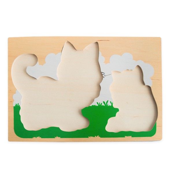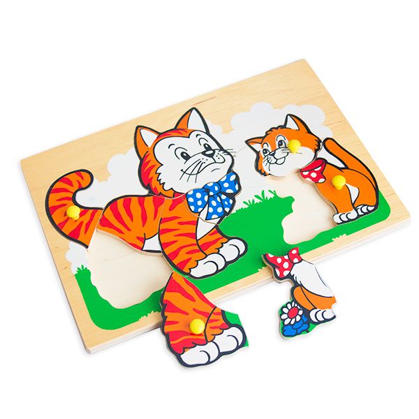 Вкладыш-головоломка размером 29,5х20,5 см, на котором изображена кошка с котенком. На вкладышах головоломки имеются ручки-кнопочки. Открыв эти элементы, ребёнок должен их закрыть, подобрав нужную по размеру и рисунку часть. Предназначены пособия для детей от 2 до 6 лет. Кроме развития мелкой моторики и координации движений, игра формирует пространственные представления: “снизу”, “сверху”, “сбоку”, “справа”, “слева”, а также логико-математические: “больше”, “меньше”, “столько же”, “поровну”, “выше”, “ниже” и т.д.