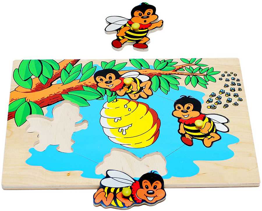 Вкладыш "Пчелы" собой деревянный планшет размером 29,5х20,5 см, изображающий четырех забавных пчелок вокруг гнезда, висящего на ветке дерева. Для удобства использования и стимуляции развития мелкой моторики вкладыши снабжены ручками-кнопочками. Игры с пчелками развивают знания ребенка об окружающем мире, формируют коммуникативные навыки и умения, пространственные представления, развивают наблюдательность и произвольное запоминание. Спрашивайте у ребенка, сколько пчел улетело (прилетело), где находится пчелка относительно улья (других пчел). В игровой форме знакомьте ребенка с лексическим разнообразием (словообразованием) слов, в частности глаголов: составляйте глагольные пары (синонимы и антонимы) «лететь-прилететь-улететь».