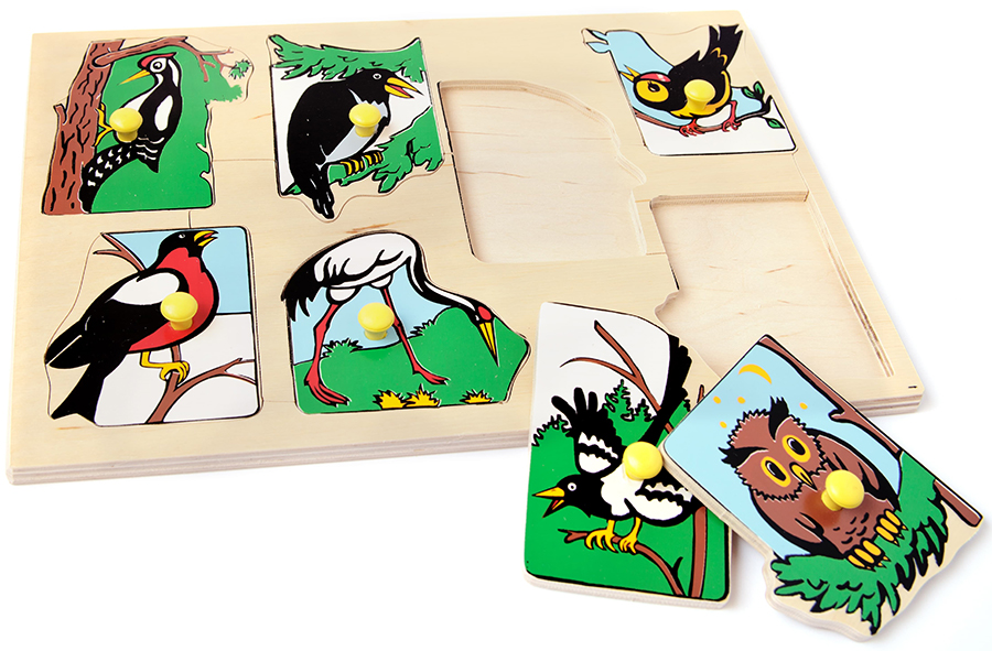 Игровое пособие представляет собой планшет размером 29,5х20,5х0,9 см, на котором находятся 7 вкладышей-«островов» с изображением птиц, населяющих Европу. На каждом вкладыше имеется ручка-кнопочка для удобства пользователей. Игровое пособие "Птицы наших лесов" представляет собой планшет размером 29,5х20,5х0,9 см, на котором находятся 7 вкладышей – островов с изображением птиц, населяющих Европу. Игры с птицами развивают знания ребенка об окружающем мире, формируют коммуникативные навыки и умения, развивают и обогащают лексический запас ребенка, способствуют формированию связности его речи. Предлагая ребенку вложить каждую игрушку на свое место, рассказывайте ему об обитателях лесов, их особенностях, повадках. При описании птиц акцентируйте внимание на названиях цветов, которыми раскрашены вкладыши. Усложняйте задания, поручая ребенку угадать и назвать птицу по вашему описанию