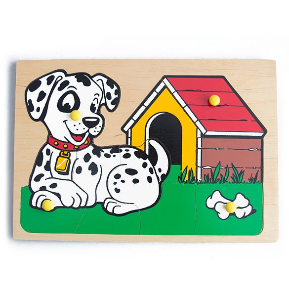 Вкладыш-головоломка размером 29,5х20,5 см, на котором изображена собачка рядом с будкой. На вкладышах головоломки имеются ручки-кнопочки. Открыв эти элементы, ребёнок должен их закрыть, подобрав нужную по размеру и рисунку часть. Предназначены пособия для детей от 2 до 6 лет. Кроме развития мелкой моторики и координации движений, игра формирует пространственные представления: “снизу”, “сверху”, “сбоку”, “справа”, “слева”, а также логико-математические: “больше”, “меньше”, “столько же”, “поровну”, “выше”, “ниже” и т.д.