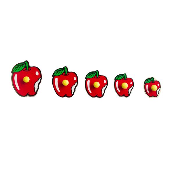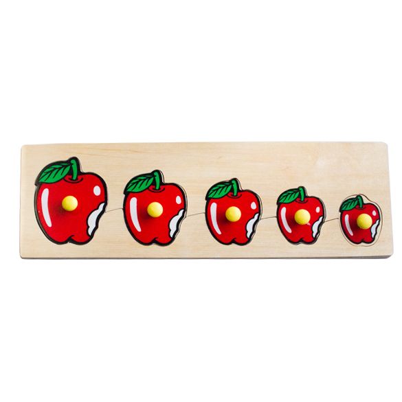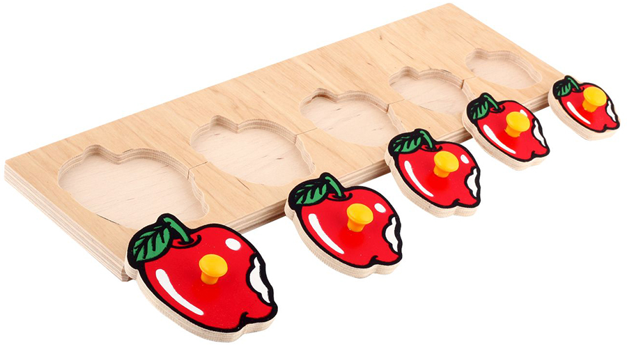 Деревянный планшет размером 29,5х9,5 см из серии «от большого к меньшему», на котором размещены 5 вкладышей в виде надкусанных яблочек с ручками-кнопочками. Вкладыши уменьшаются в размерах от большего к меньшему в направлении слева направо. Логическая разборная доска-вкладыш помимо развития мелкой моторики поможет сформировать у малыша представления о величине и количестве, научит его осмысленно употреблять слова «большой», «маленький», «средний», «самый маленький», «самый большой», «больше чем», «меньше чем». Пособие может использоваться для занятий с детьми от 2 до 5 лет. Играя с ребенком, давайте ему задания на сравнение фигурок, счет, в том числе и с использованием порядковых числительных первый, второй и так далее, выстраивание их в правильной последовательности («по росту»). Фигурки можно обводить, разукрашивать или заштриховывать полученное изображение, а затем придумать и нарисовать целую историю.