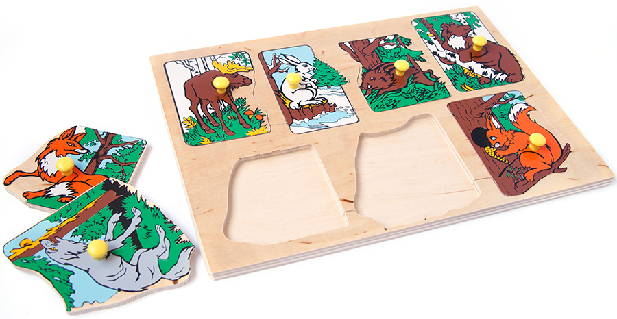 Пособие представляет собой планшет, на котором размещены вкладыши – острова с изображением семи наиболее распространенных животных Европы и средней полосы России. Вкладыши, изображающие лося, зайца, кабана, медведя, лису, волка и белку, дополнены фоном мест их обитания. Вкладыши помещены в соответствующие выемки. На каждом из вкладышей имеется удобная ручка-кнопочка. Рамка-вкладыш "Животные наших лесов" состоит из 7 (семи) вкладок, каждая из которых снабжена удобной ручкой. На вкладках изображены различные животные. Ваш малыш познакомится в игровой форме с этими представителями животного мира наших лесов, найдет для каждого из них своё место и расскажет вам много интересного. Методика проведения занятий очень проста: родители показывают ребенку доску с уложенными вкладками, затем высыпают их и предлагают ребёнку вложить каждую вкладку на место, сопровождая игру рассказом о каждом животном, его образе жизни, среде обитания, поведении и особенностях. Затем взрослый описывает животное или загадывает загадки, а дети отгадывают. Для старших детей можно предложить следующий вариант игры. Взрослый произносит четко звуки, например: «С, Д, В, Р, Ж», а дети показывают вкладыш с животным, определяя, где находится звук: в середине, начале или конце слова.
