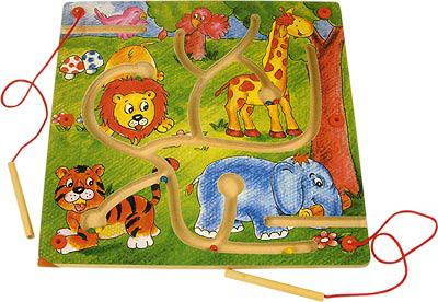 Развивающая деревянная игрушка с магнитными палочками и шариками, катающимися по дорожкам. Игра происходит в окружении милых африканских животных.