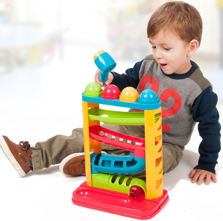 Пластмасса. Конструкция состоит из двух полукруглых вертикальных основ высотой 29,7 см с отверстиями по периметру, между основами располагаются надежно закрепленные наклонные желобы для скатывания шариков 4-х ярусов.Нижнее горизонтальное основание имеет длину 24,7 см в самой широкой части, приставной желоб для сбора шаров. В верхней части основы располагается 4 отверстия для шариков диаметром 5 см. Отверстия имеют диаметр который не позволяет шарикам свободно провалиться в желобок. Шарики необходимо "забить" молоточком в отверстия после чего он поподает в желобок и самостоятельно (без помощи) прокатывается по 4 уровням вниз. В комплекте 4 шара различных цветов диаметром 4,5 см, молоточек длиной 16 см. Игра для тренировки глазных мышц, зрительно-моторной координации, развития ориентировки в пространстве и наглядно-действенного мышления. Помещая 4 шара в верхнюю часть башни, ребенок развивает ориентацию в пространстве. Ударяя по ним молотком со звуком, можно в игровой форме проверить причинно-следственную связь.