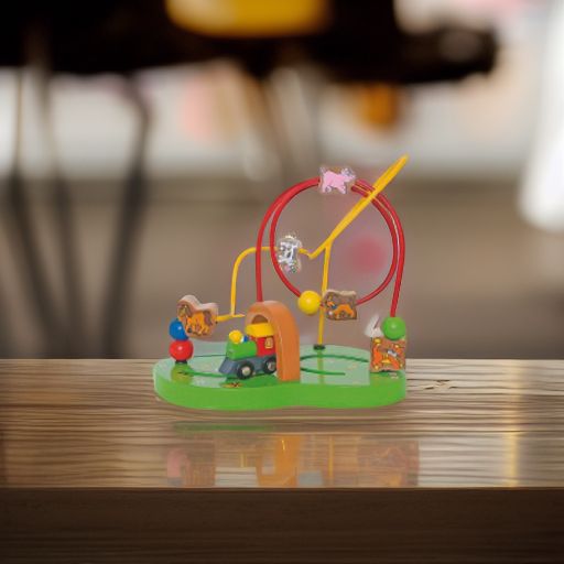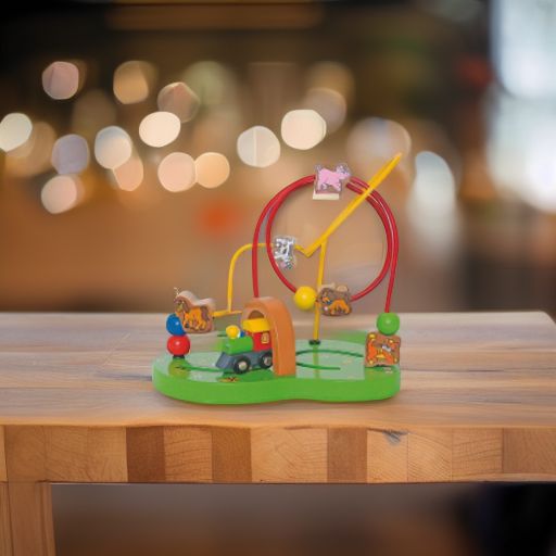Развивающая деревянная игрушка с изогнутой проволокой с разноцветными подвижными бусинами вокруг него.