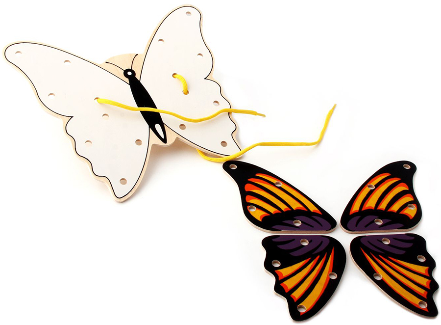 Шнуровка "Бабочка" представляет собой фанерный контур, изображающий бабочку, и 4 отдельные детали - крылья. Во всех элементах «бабочки» имеются круглые отверстия для продевания шнуров и скрепления частей игрушки. Предложите ребенку наложить часть крылышка на контур, соединив соответствующие отверстия, и прикрепить ее с помощью шнурка. Соединив все детали, вы получите законченное изображение. Играя с данной шнуровкой, ваш ребенок развивает мелкую пальцевую моторику, точность и скоординированность движений. Дополните игру познавательным элементом - научите ребенка определять правое и левое крыло, нижнее и верхнее, научите считать отверстия. А в завершение позвольте малышу пофантазировать: помогите ему обрисовать трафарет бабочки и предложите разукрасить контур, придумать сказку о своей бабочке