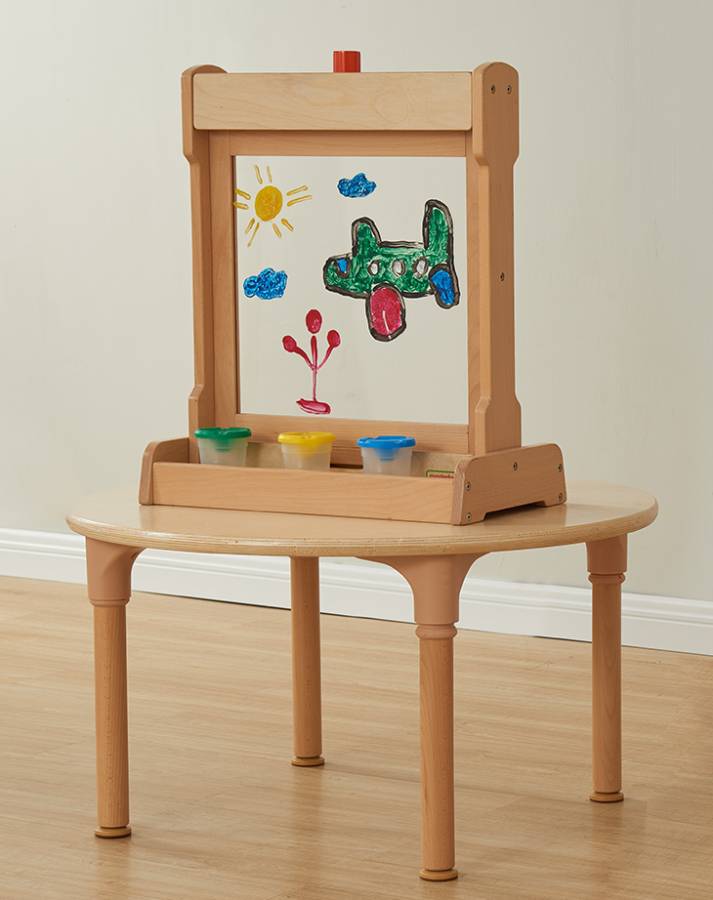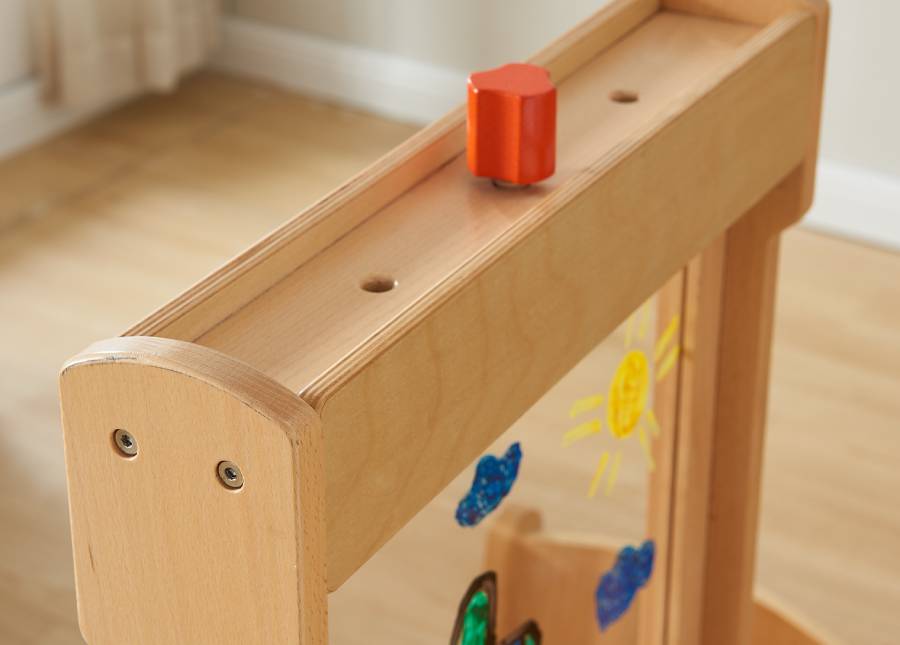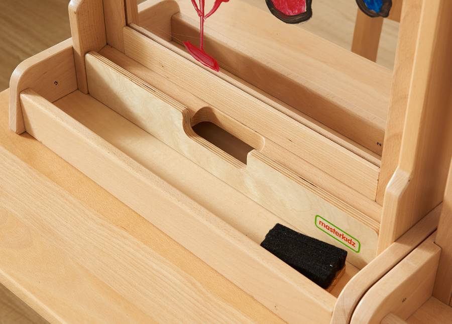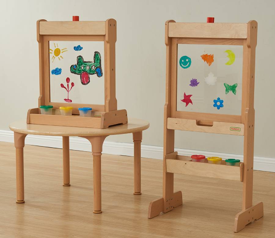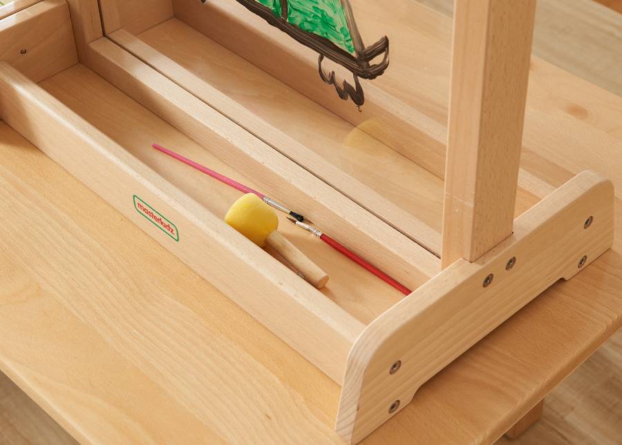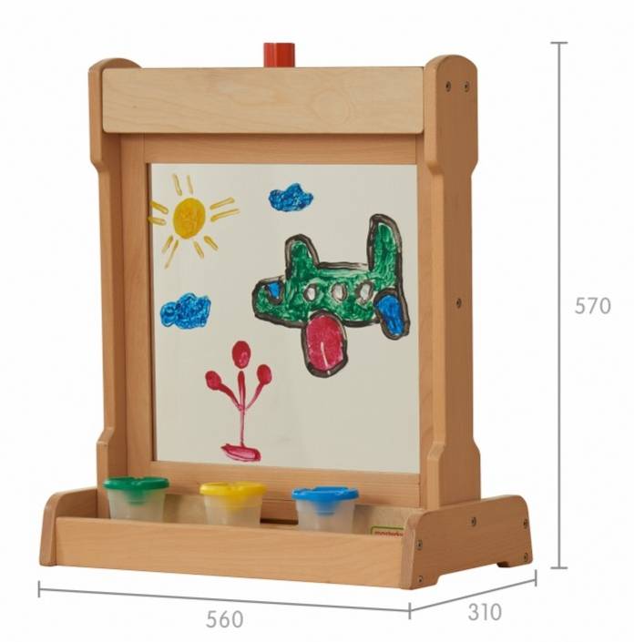 Настольный мольберт для рисования выполнен из массива бука. Пособие можно использовать в двух вариациях: 1) Для рисования - в центре мольберта зафиксировано акриловое окно для рисования маркерами на водной основе или красками. В нижней части имеется подставка для банок с красками и кисточек. 2) для размещения развивающий панелей Masterkidz серии ME размерами 460*460мм, например ME13774, ME03713, ME07285. Воспитатели смогут легко менять панели в соответствии с нужной темой и займет это менее минуты. В верхней части мольберта имеется вращающийся фиксатор для закрепления панели. Мольберт является двусторонним, что позволяет задействовать в игровом процессе больше детей. Этот прочный мольберт поставляется с прозрачным акриловым окошком, на котором дети могут рисовать раз за разом. Им понравится рисовать акварельными красками и кистями или фломастерами на водной основе. После использования поверхность можно просто протереть. Дети могут нарисовать все, что им заблагорассудится, или портрет друга, который они видят по другую сторону окна. Конструкция включает в себя деревянный поднос для хранения баночек с красками и кистей. Их также можно использовать со всеми учебными настенными элементами Masterkidz, которые при необходимости можно вставить в рамы, создавая новые возможности. К этим мольбертам прилагается дополнительная двусторонняя доска (магнитная с одной стороны и доска для письма с другой), которая позволяет использовать их в качестве подставки для зеркала, письменного стола, мольберта для рисования или, при добавлении любого настенного элемента, в качестве учебной доски. Смена досок происходит быстро, легко и без использования инструментов. Изготовленные из высококачественной европейской буковой и березовой фанеры, они являются гибким, практичным и полезным предметом классной мебели. Размер: высота 640 мм, ширина 535 мм. Прозрачное акриловое окошко для создания творческих работ красками на водной основе Компактный мольберт (высота 640 мм) Можно использовать на рабочем столе или на полу Все обучающие доски/настенные элементы Masterkidz устанавливаются с помощью простой системы крепления Двусторонний Под окном для рисования имеется углубление для хранения баночек с красками и кистей Может использоваться снова и снова Изготовлен из высококачественной фанеры из европейского бука и березы Покрытие водостойким лаком, поэтому его можно протирать влажной тканью