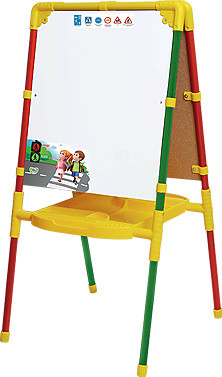 Устойчивый и удобный мольберт с двумя рабочими поверхностями. Одна сторона мольберта - металл для работы с магнитной азбукой и рисования маркерами на водной основе, другая сторона - кашированный ДВП для рисования мелом.