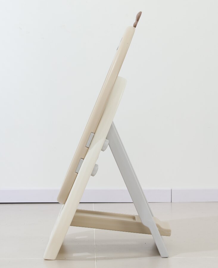 Мольберт имеет несколько регулировок по высоте, легко складывается и имеет удобную ручку для переноски. В основании доски и на передней части имеются места для хранения магнитных деталей, фломастеров и губки для стирания, которые входят в комплект.