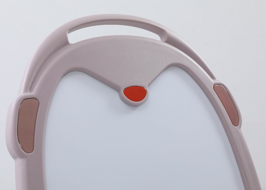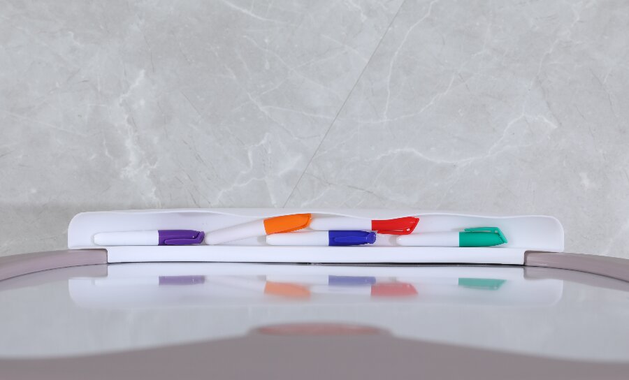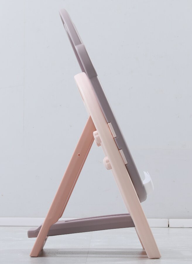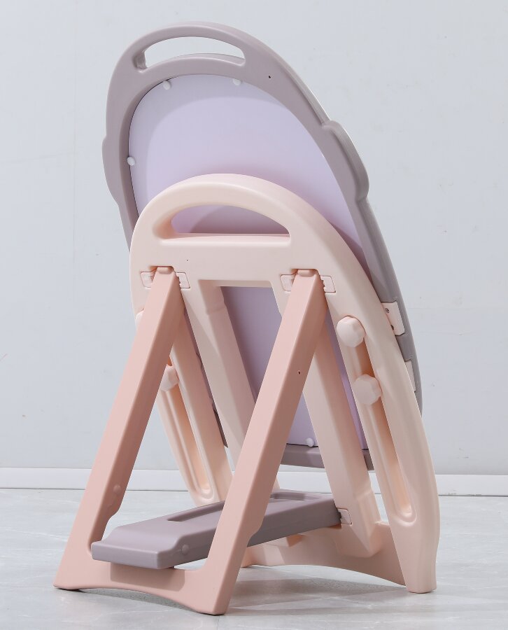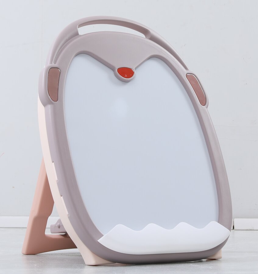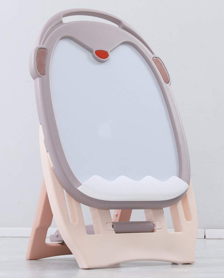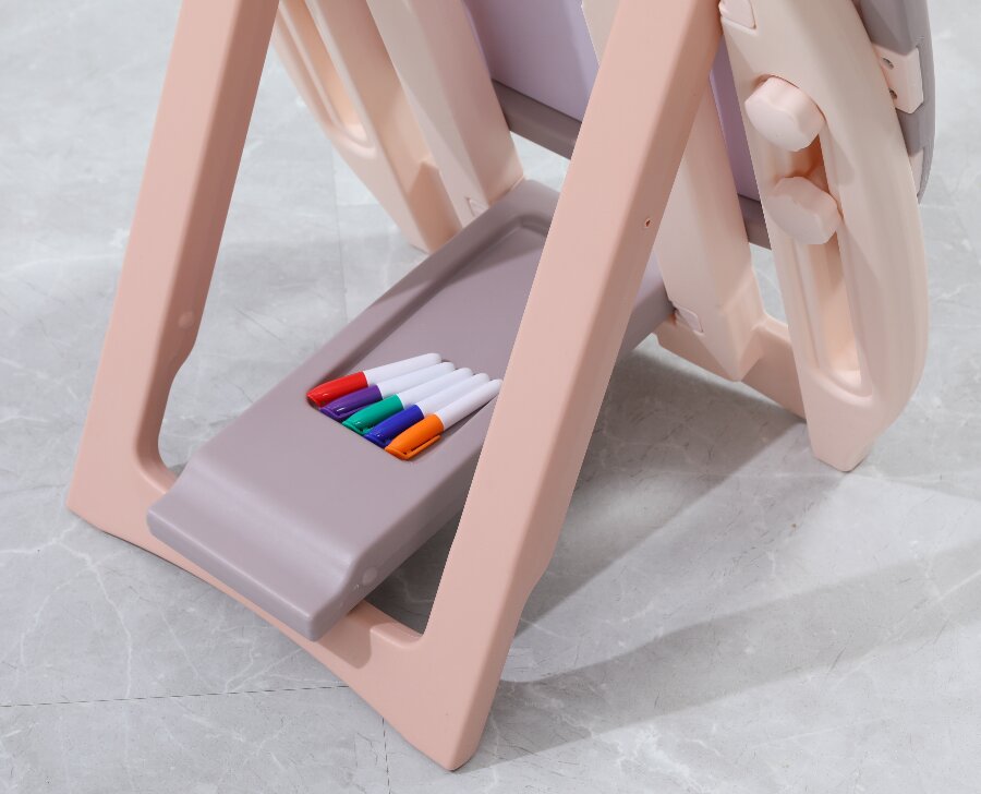 Мольберт имеет несколько регулировок по высоте, легко складывается и имеет удобную ручку для переноски. В основании доски и на передней части имеются места для хранения магнитных деталей, фломастеров и губки для стирания, которые входят в комплект.