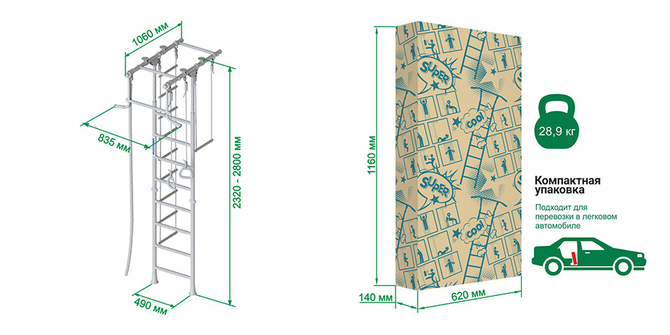 Комплектация: турник, канат, кольца гимнастические, трапеция, лестница веревочная