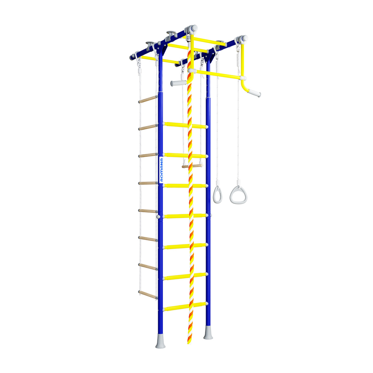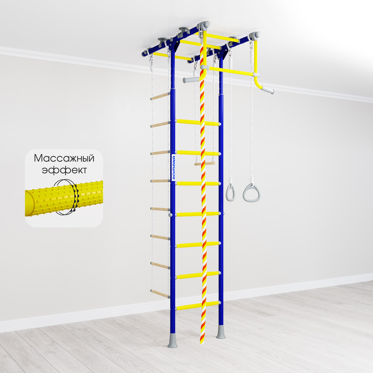 Конструкция ROMANA R1 надежно устанавливается враспор к потолку, выдерживает вес в 100 кг (испытывается при нагрузке в 200 кг). В самом комплексе широкий выбор навесного оборудования: веревочная лестница, трапеция, кольца, канат. Ступени с массажным эффектом развивает моторику рук и служат профилактикой плоскостопия.
