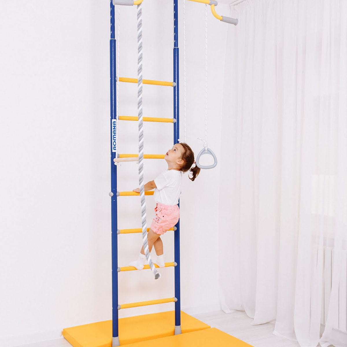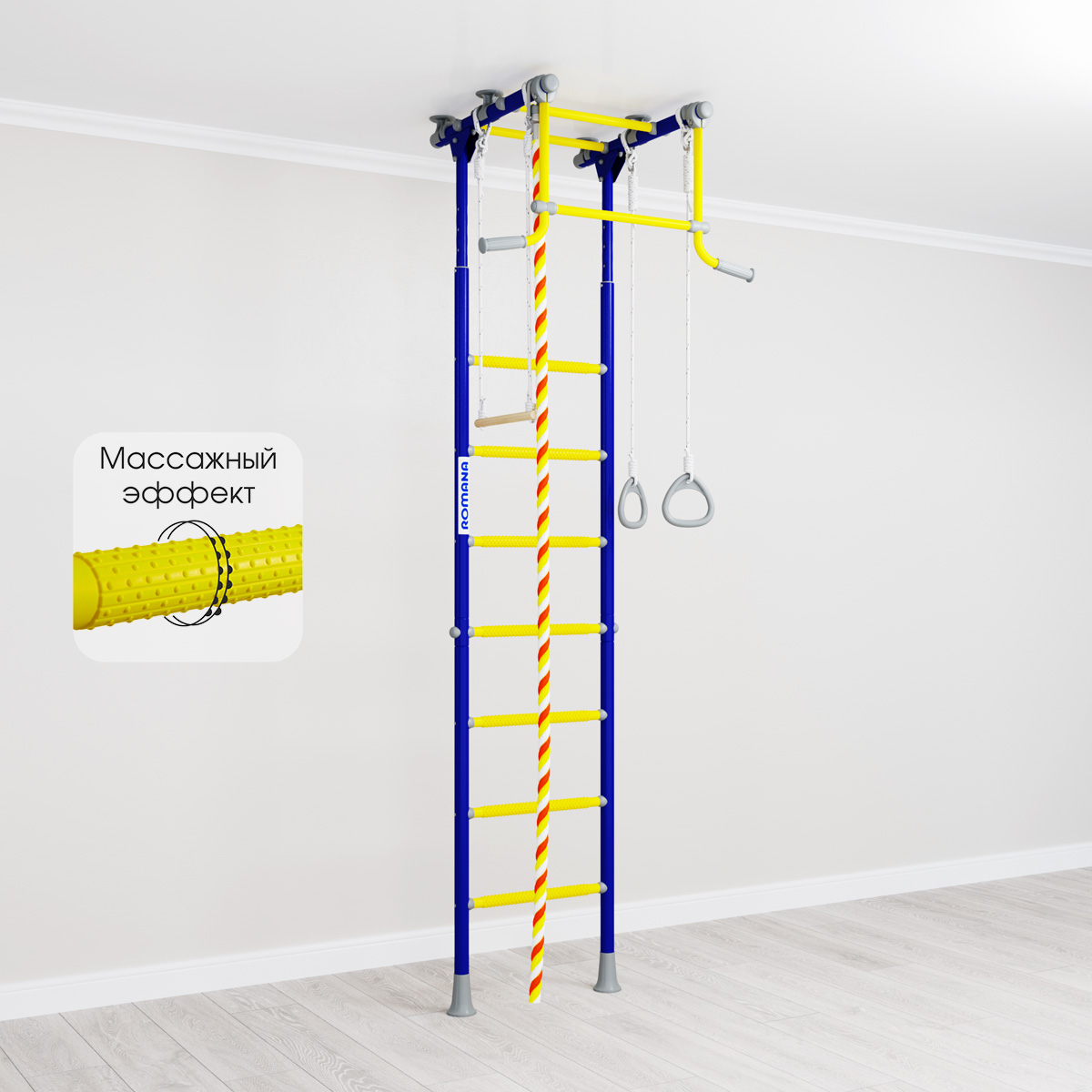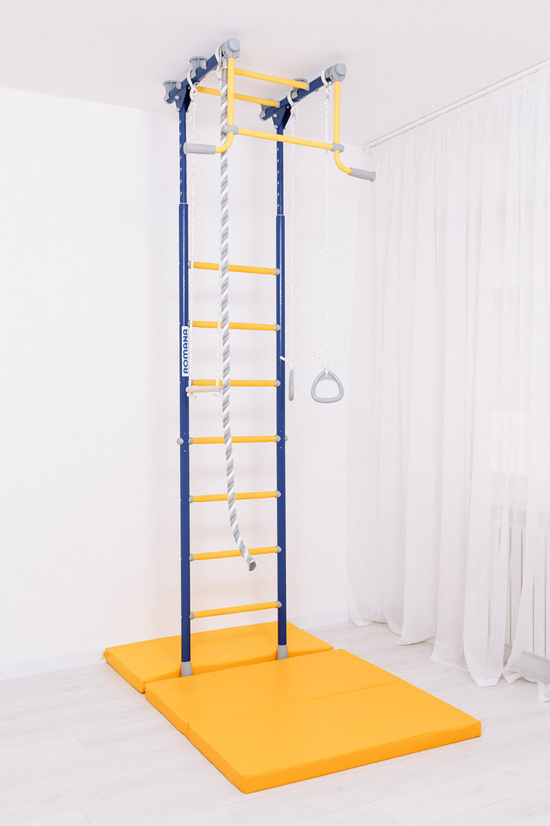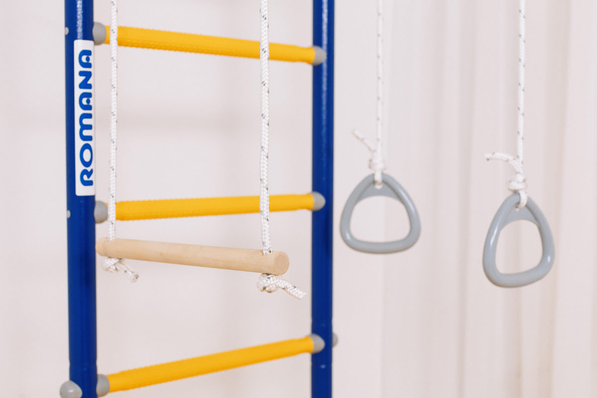 ROMANA R2 быстро собирается и устанавливается. Ширина лестницы - 49 см, ступени массажные, благодаря чему исключается скольжение ног и рук, стимулируется общая моторика. В комплекте в наличии все самое популярное навесное оборудование — трапеция, кольца и канат.