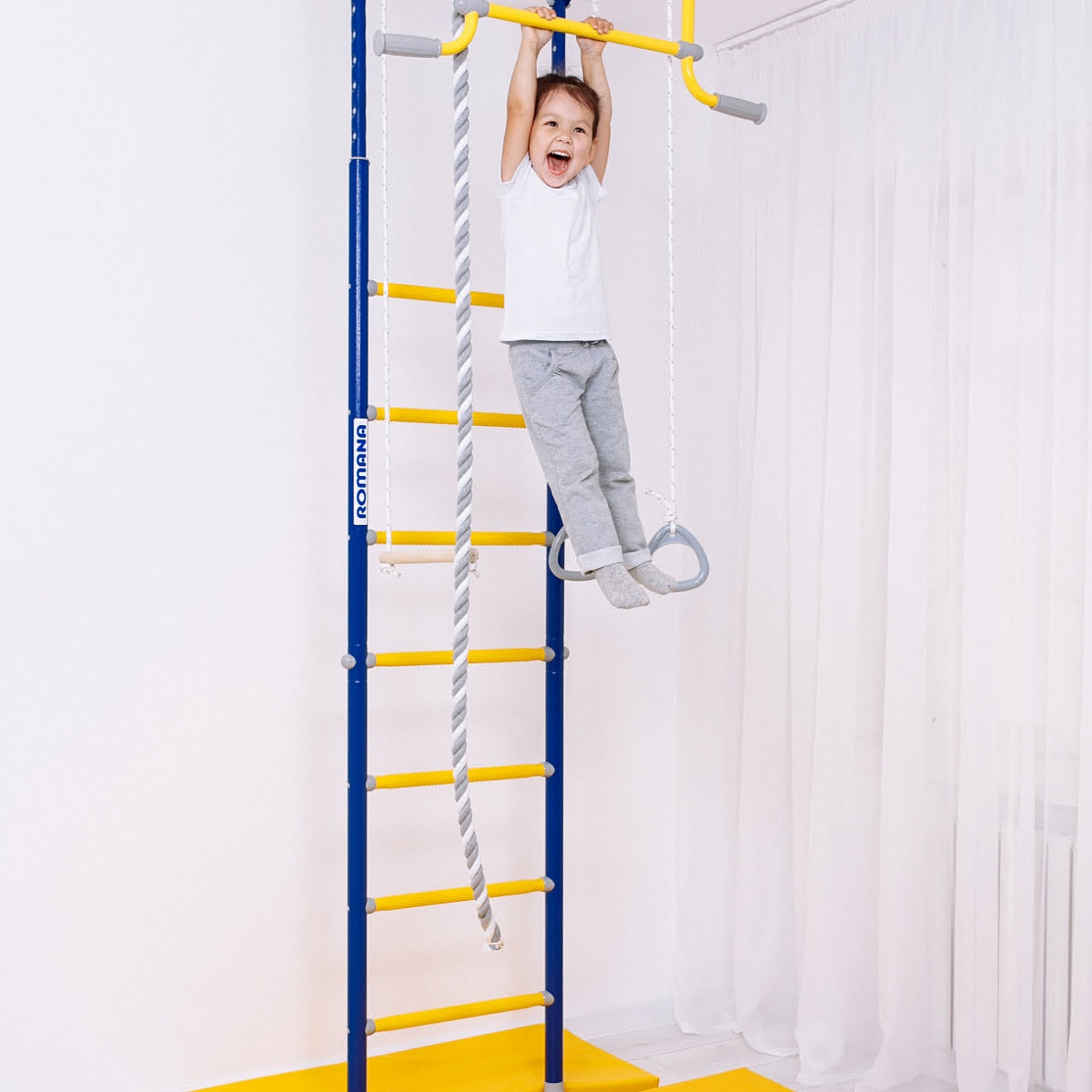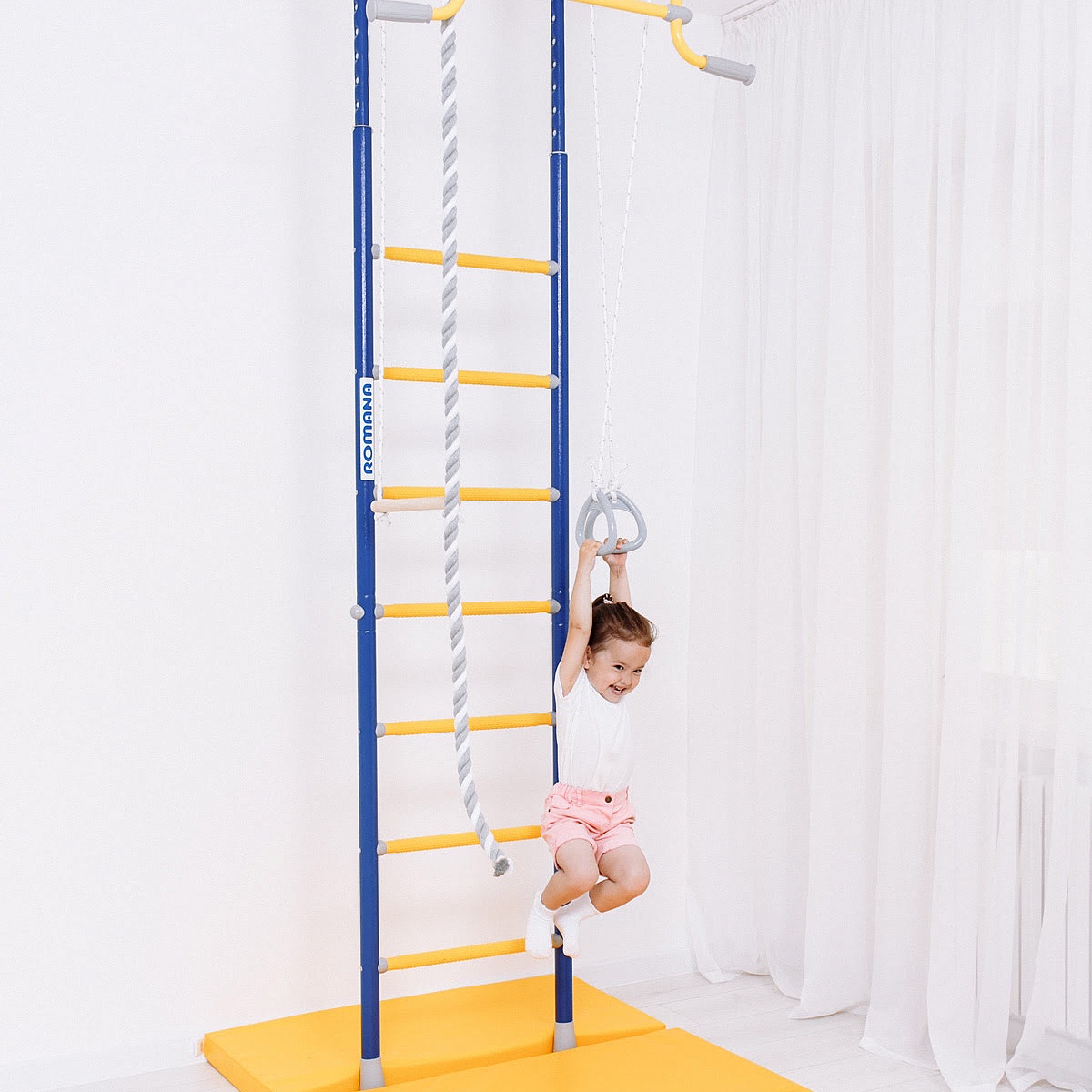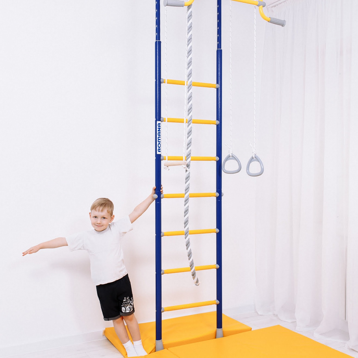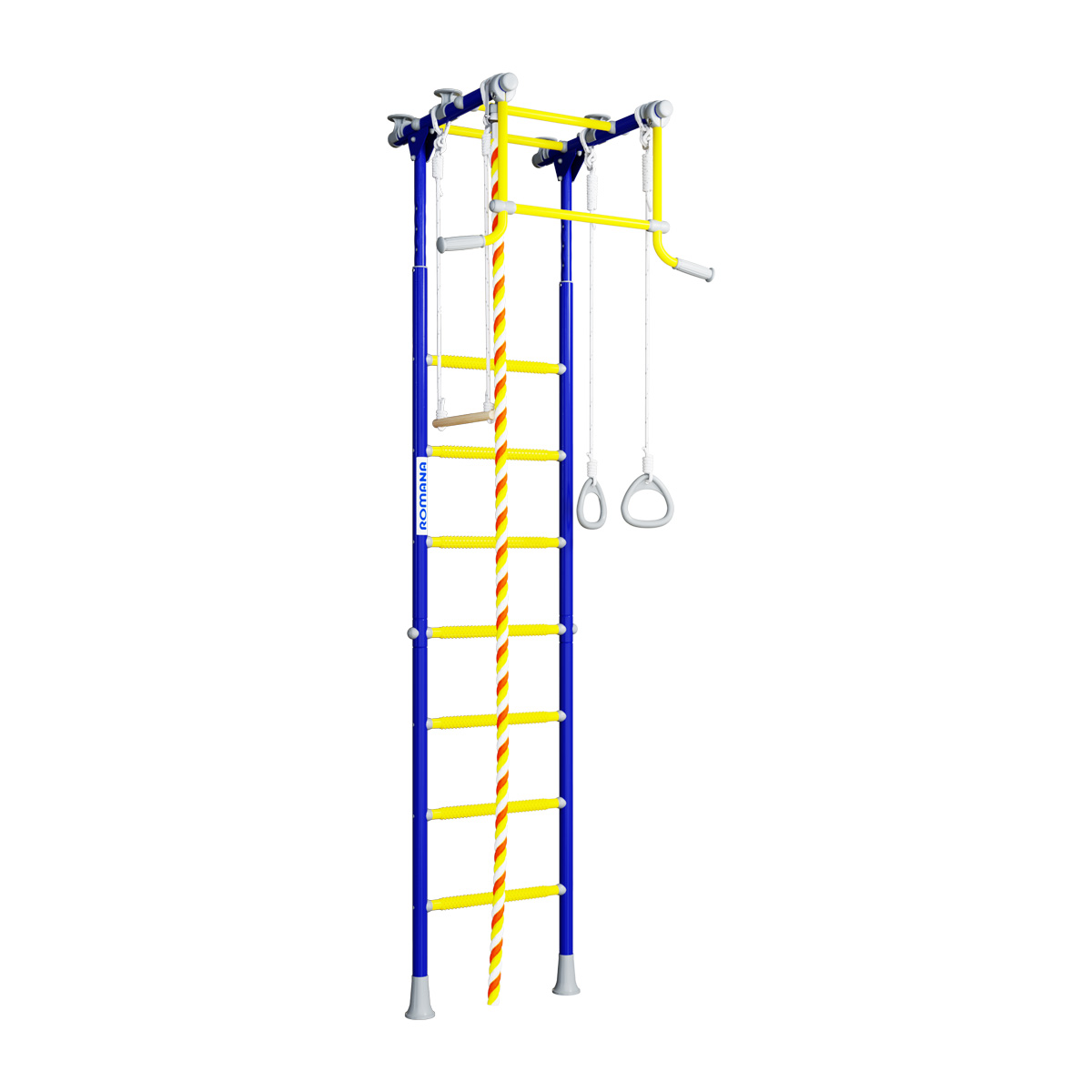 ROMANA R2 быстро собирается и устанавливается. Ширина лестницы - 49 см, ступени массажные, благодаря чему исключается скольжение ног и рук, стимулируется общая моторика. В комплекте в наличии все самое популярное навесное оборудование — трапеция, кольца и канат.