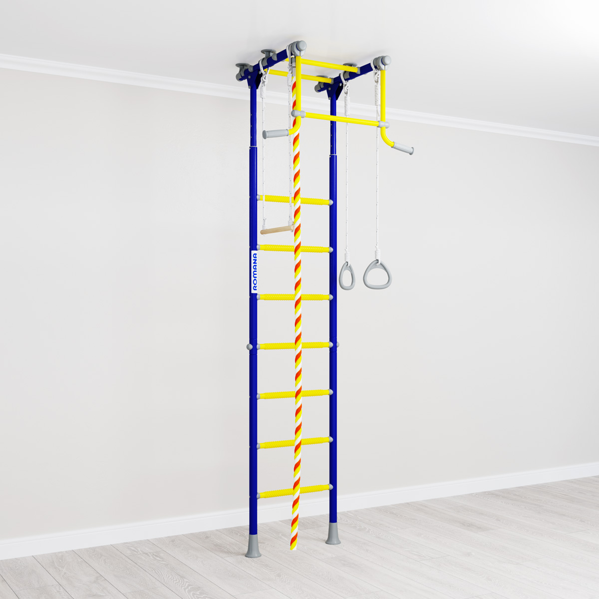 Детский спортивный комплекс ROMANA R2 - выбор для владельцев домов и квартир, которые не хотят сверлить стены для установки шведской стенки. Комплекс устанавливается враспор, что означает, что его можно переставлять в любую точку квартиры закрепив между полом и потолком. При этом допустимый вес - 100 кг (испытания проводятся при весе 200 кг).