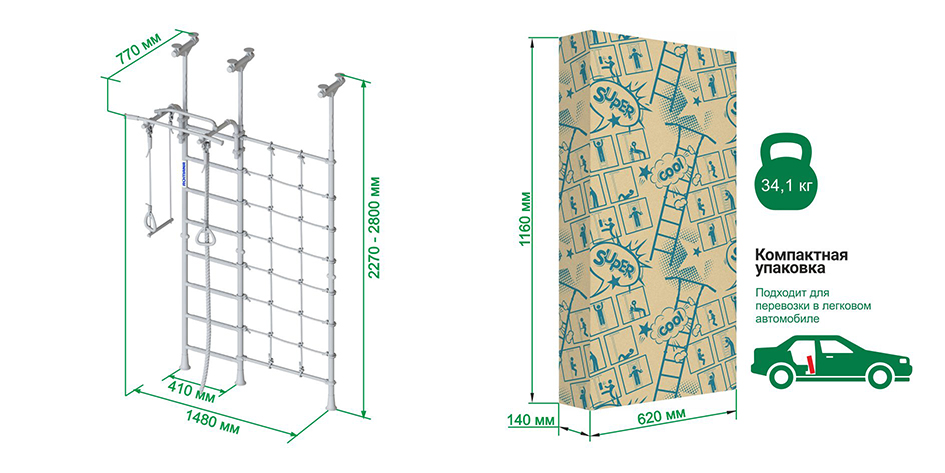 Комплектация: турник подвижный, канат, кольца гимнастические, сетка для лазания