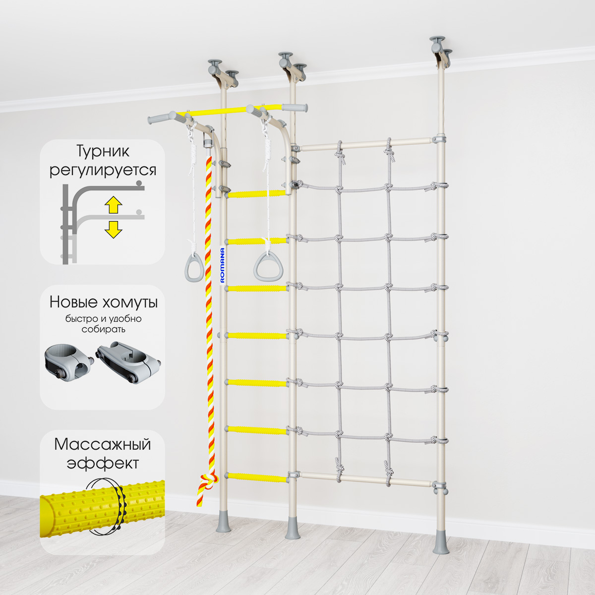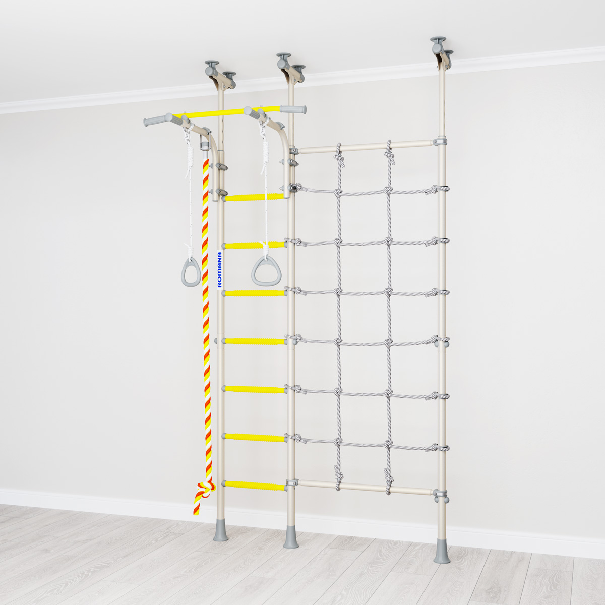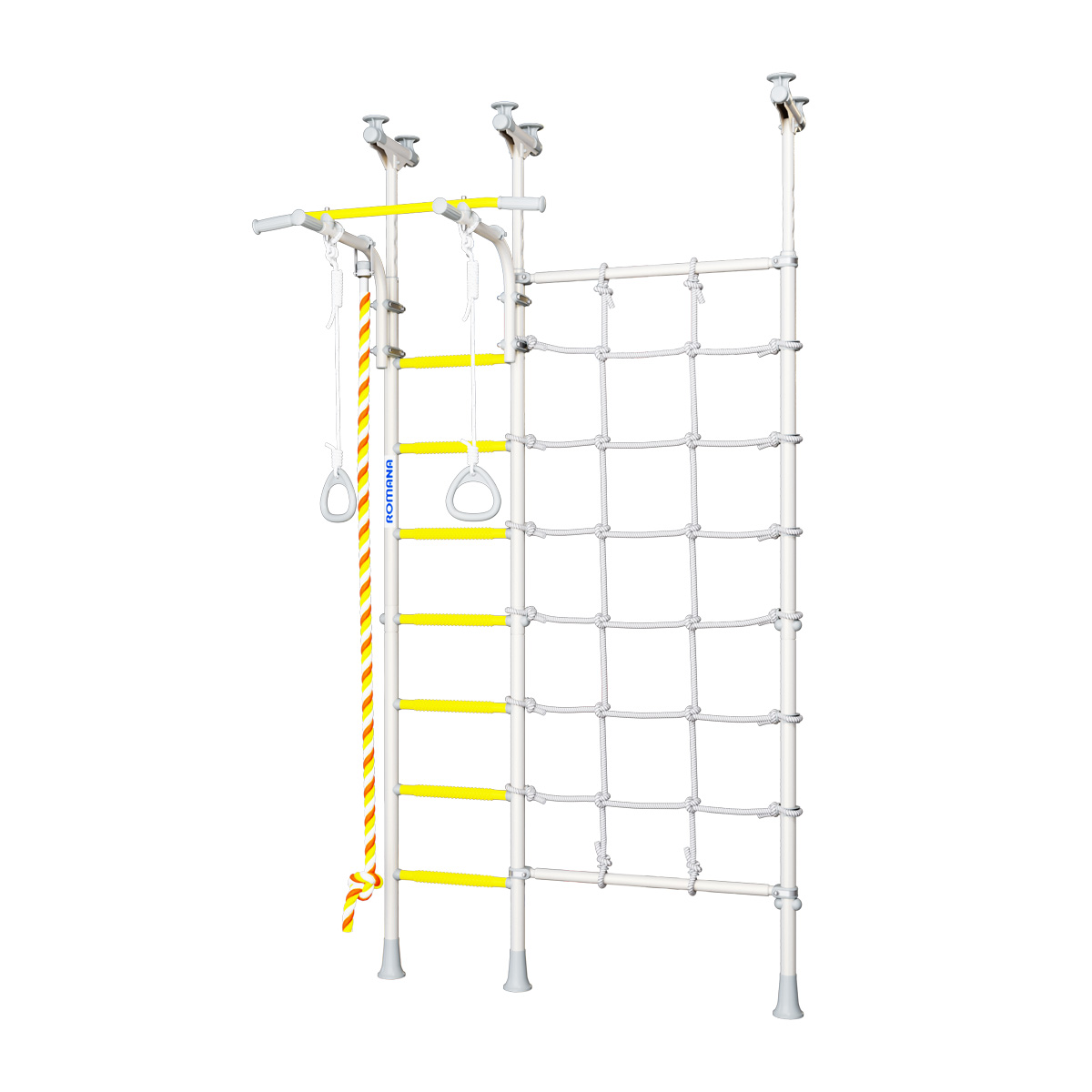 Детский спортивный комплекс ROMANA R3 устанавливается враспор, поэтому для его установки не нужно сверлить стены. У этого комплекса есть преимущество перед рядом распорных моделей - предусмотрен перемещаемый турник, который можно крепить на любой высоте с помощью специальных удобных хомутов.