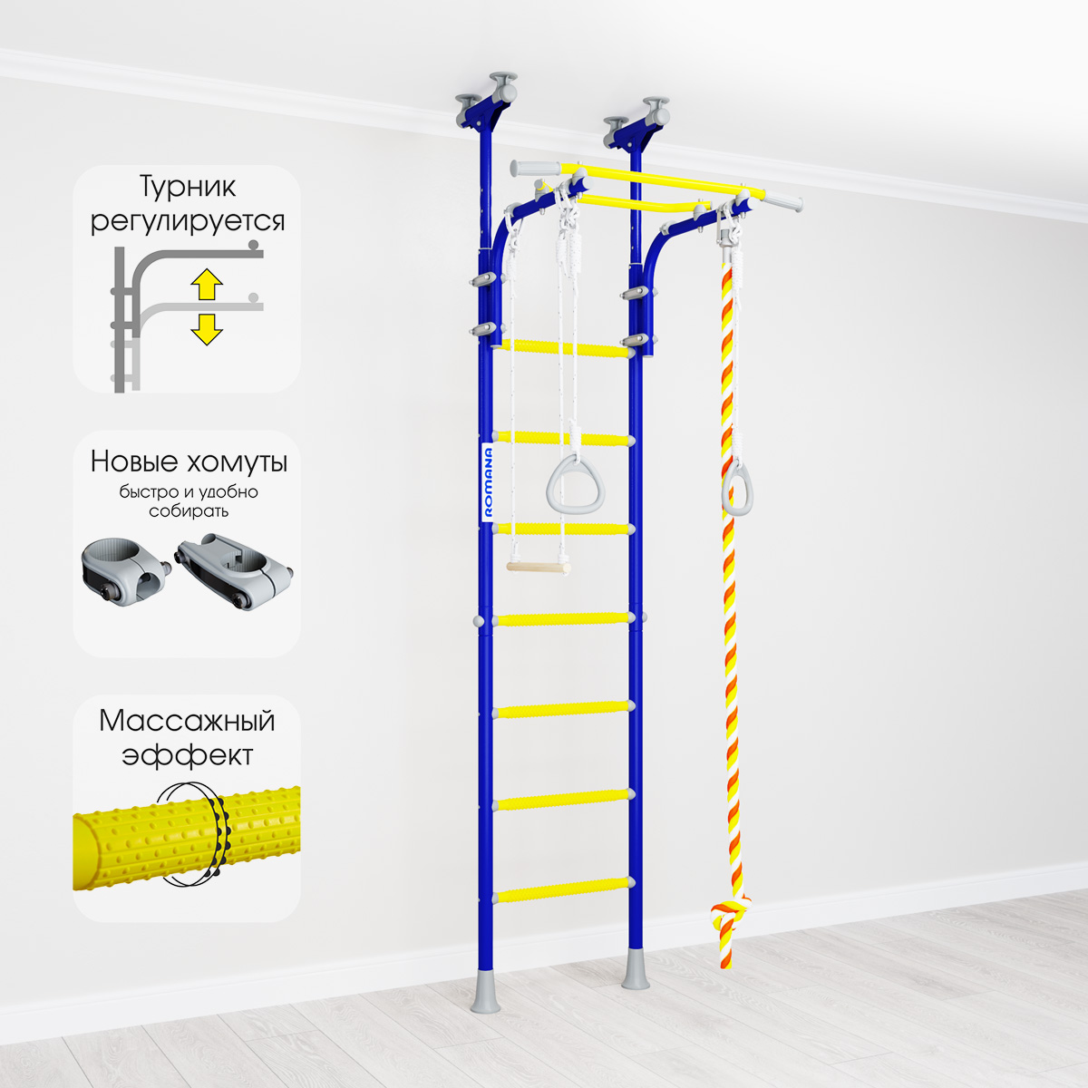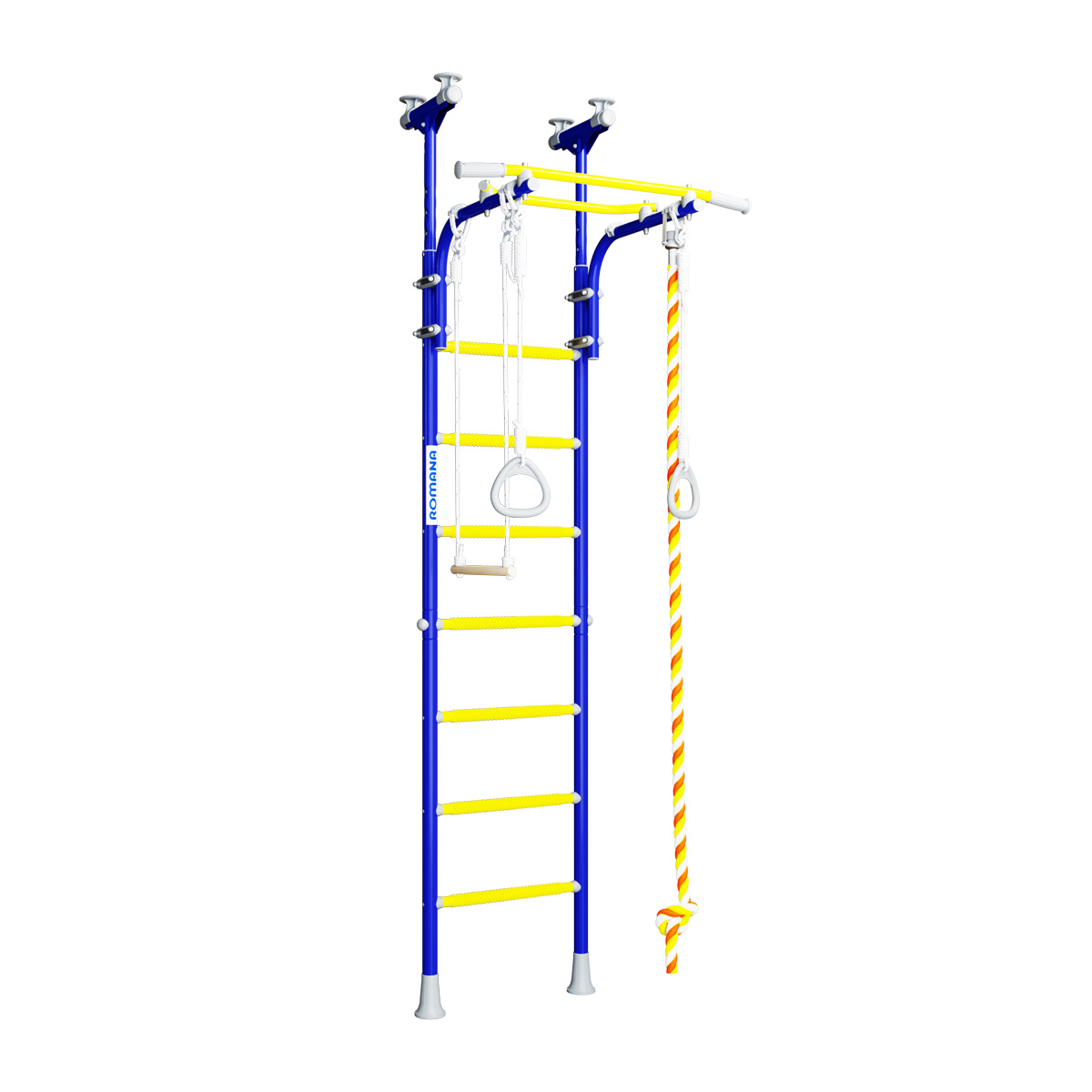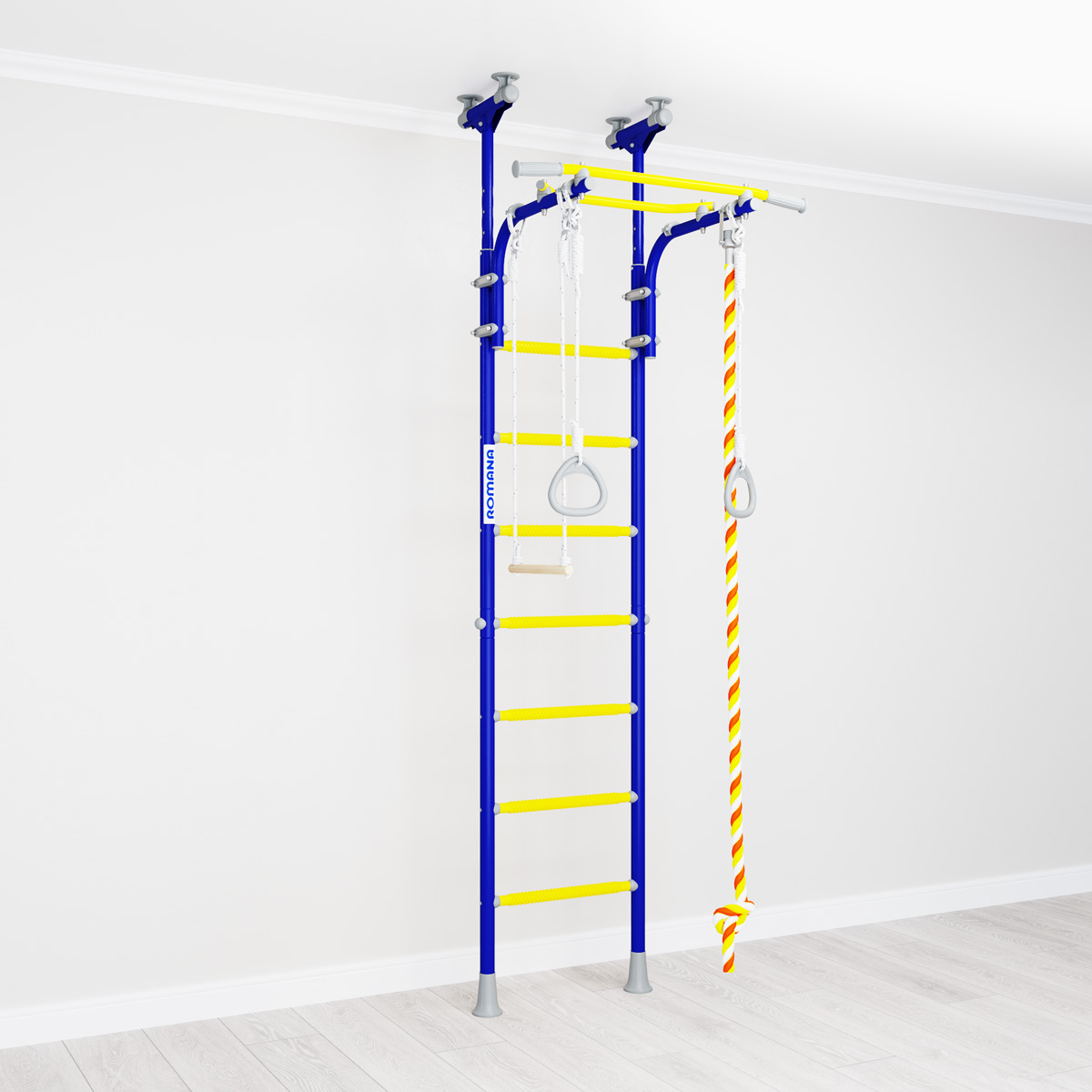 Детский спортивный комплекс ROMANA R5 Kometa - современная шведская стенка с возможностью установки враспор к полу и потолку. Не нужно сверлить стену и крепить к ней раму. Металлокаркас стенки рассчитан на вес в 100 кг (испытан нагрузкой в 200 кг).