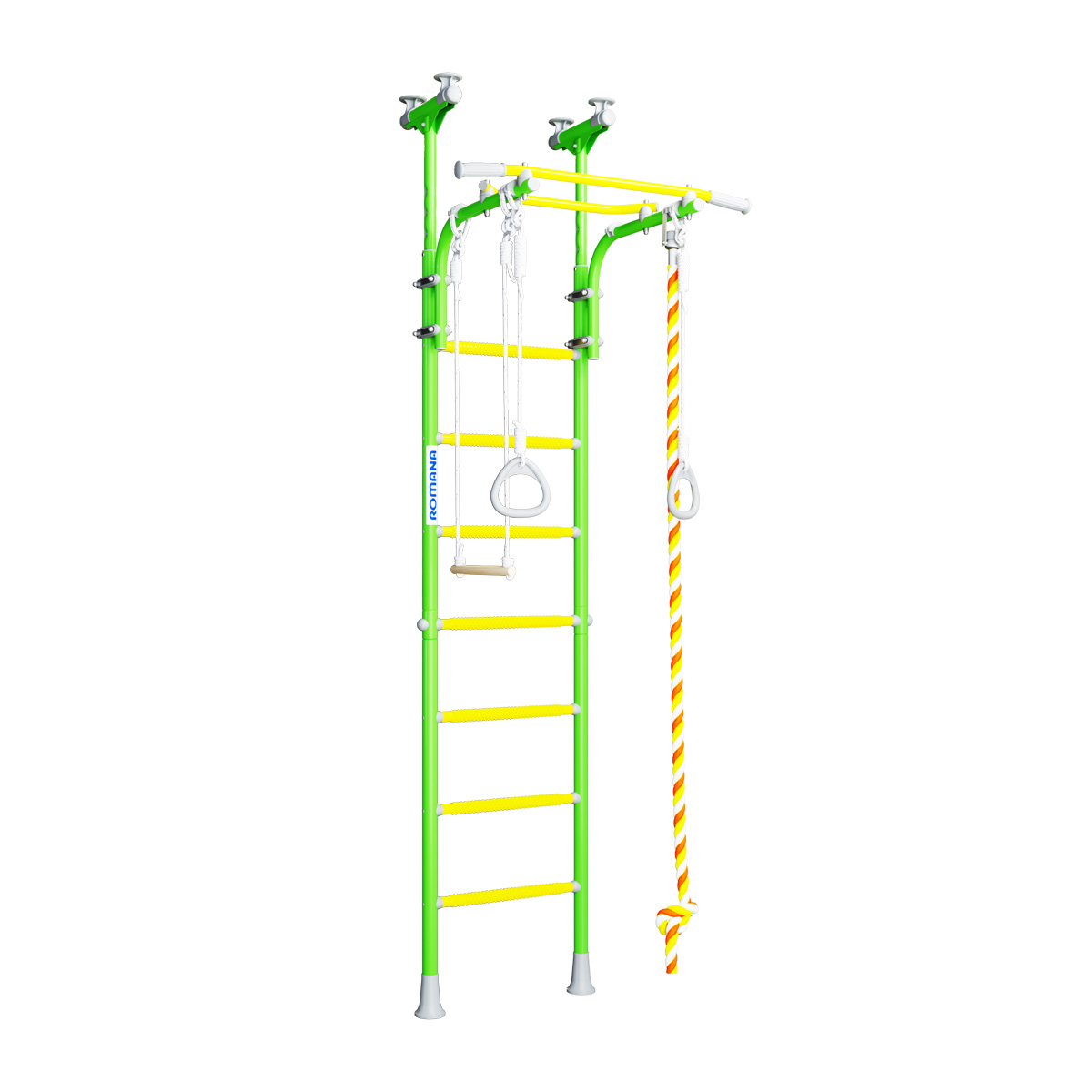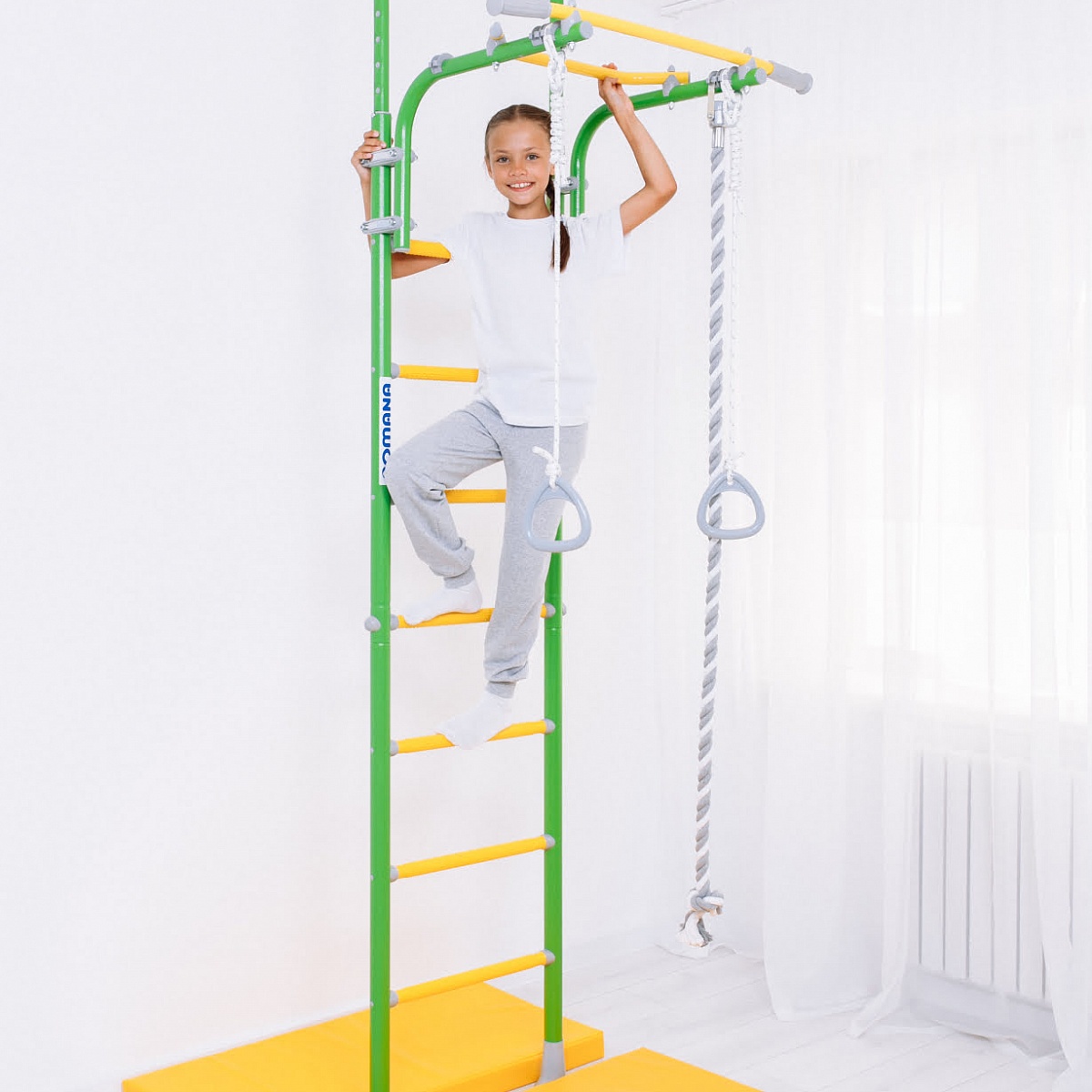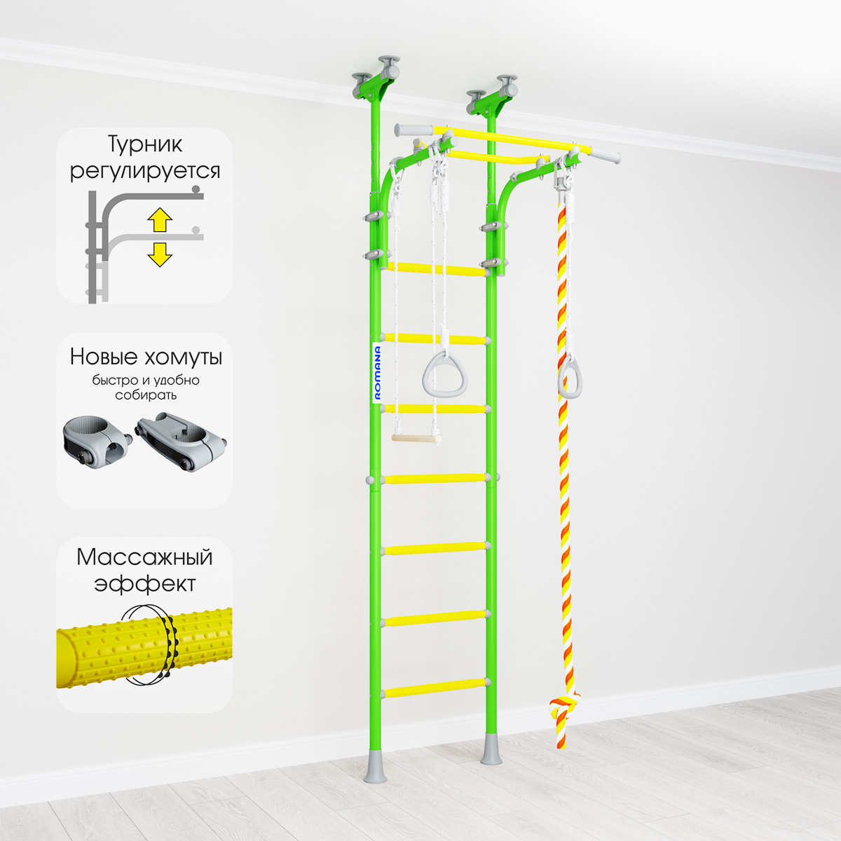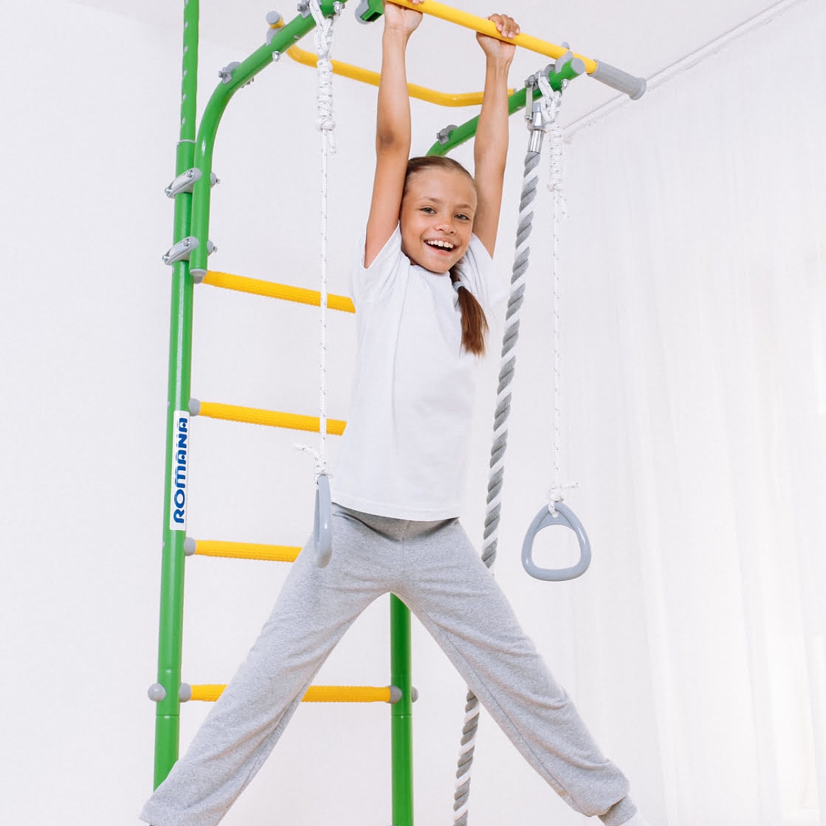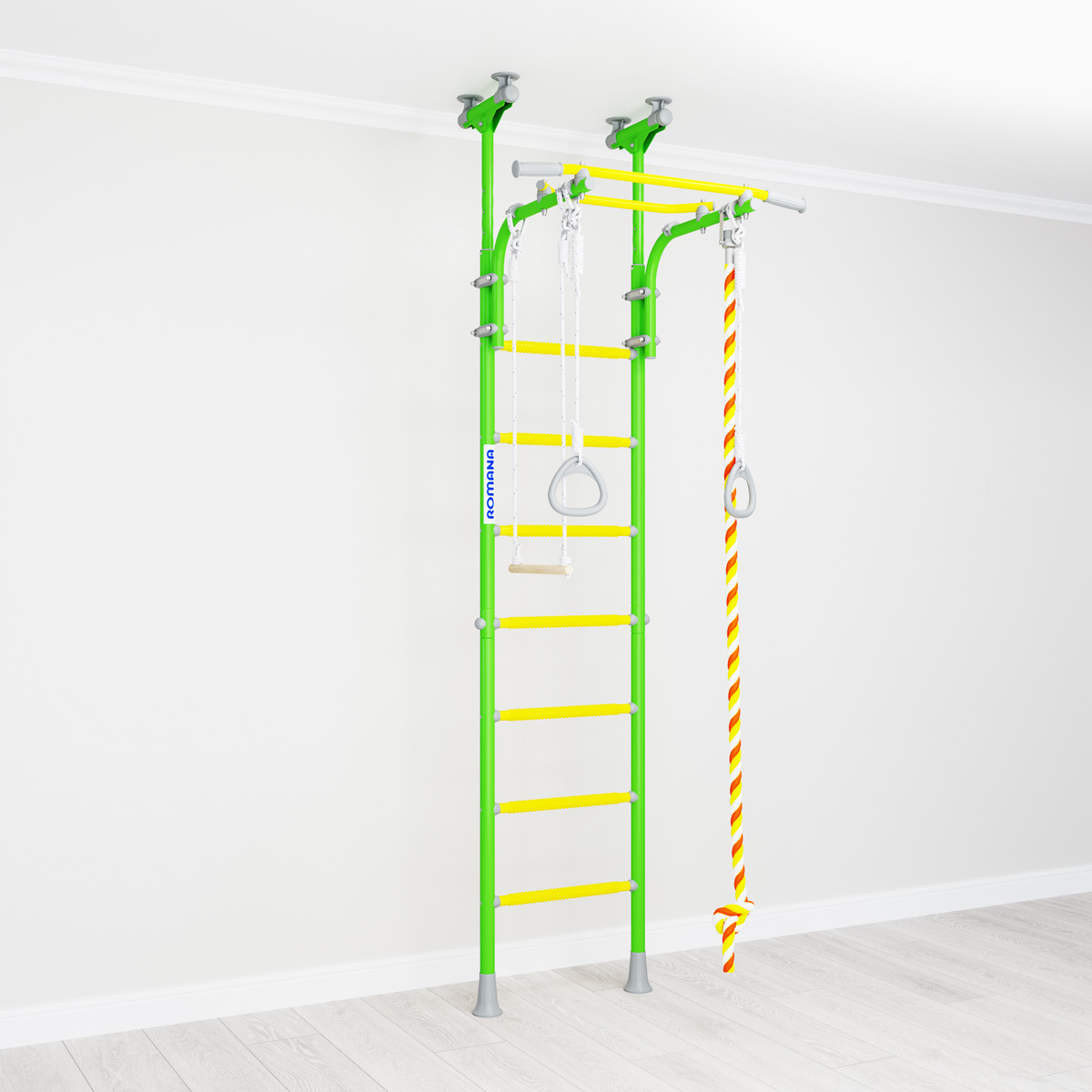 Детский спортивный комплекс ROMANA R5 Kometa - современная шведская стенка с возможностью установки враспор к полу и потолку. Не нужно сверлить стену и крепить к ней раму. Металлокаркас стенки рассчитан на вес в 100 кг (испытан нагрузкой в 200 кг).