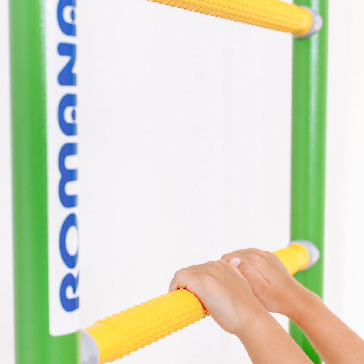 В ROMANA R5 Kometa регулируемый по высоте турник, который крепится на надежные современные хомуты. Его можно зафиксировать на нужную детям высоту. Ребенок растет - можно переставить турник повыше. Предусмотрены специальные массажные ступени для лестниц, они исключают скольжение ног и рук и развивают мелкую моторику. В комплектацию входит самое популярное среди детей навесное оборудование: кольца, трапеция, канат.
