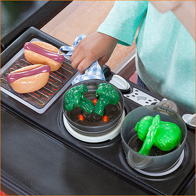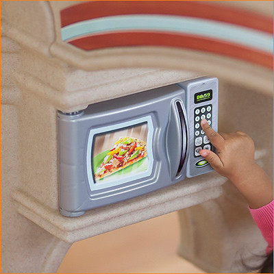 Она включает микроволновую печь, духовку, плиту, холодильник, почти двухметровую столешницу, предназначенную для приготовления еды детям, большую мойку со смесителем, сотовый телефон, симпатичные ящики для хранения предметов кухонной утвари.