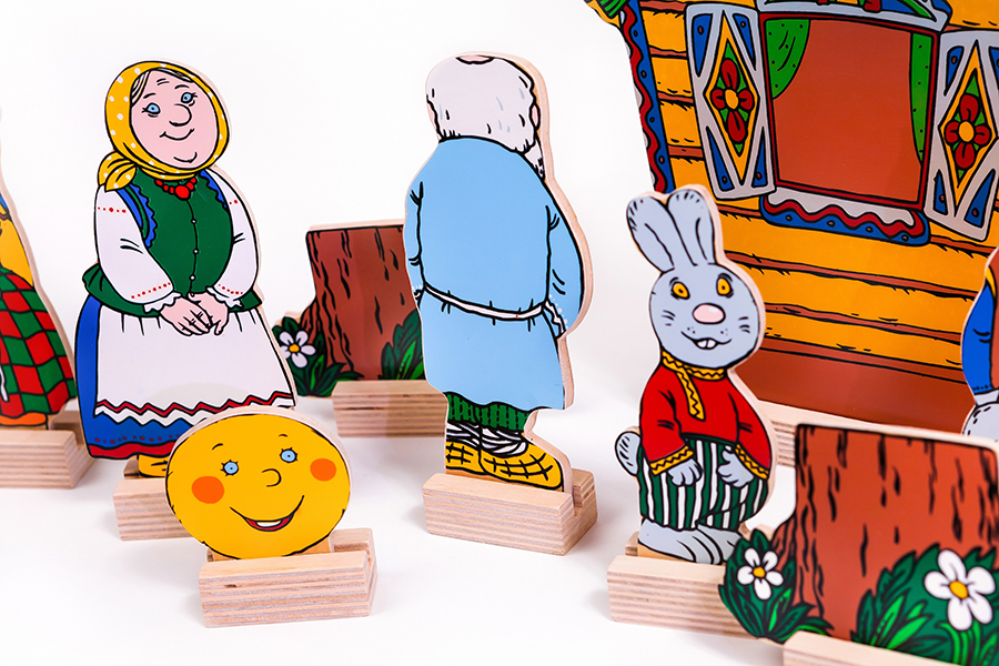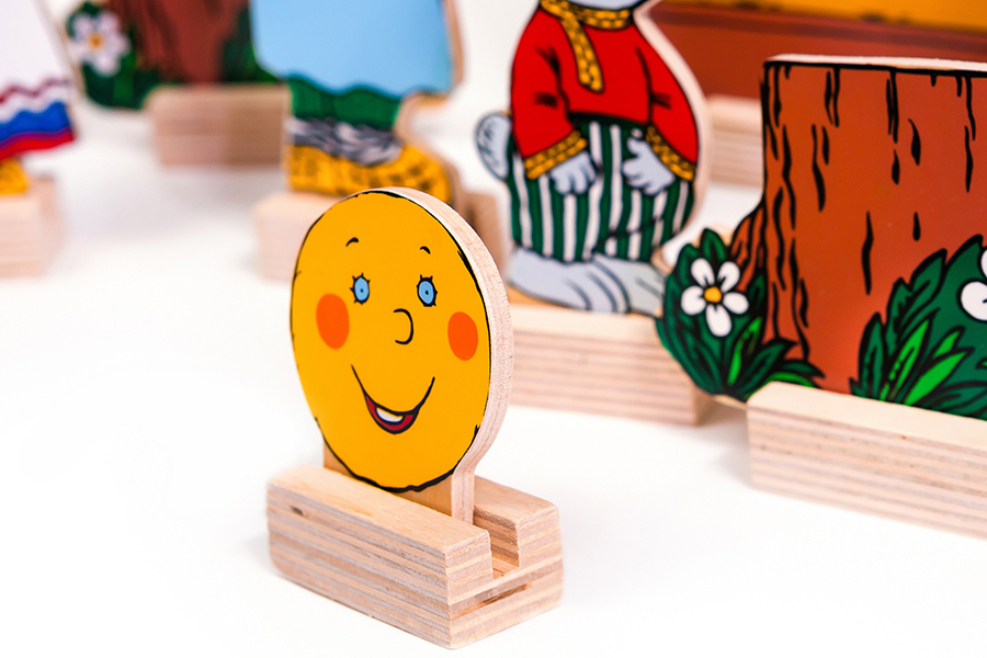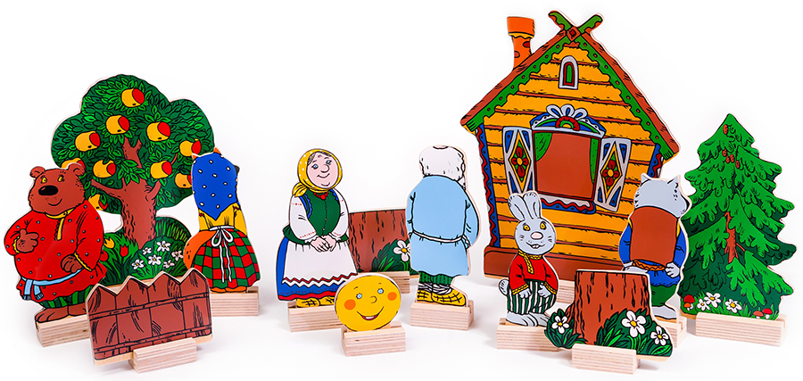 В состав настольного театра «Колобок» входит 14 деталей: дед, бабка, колобок, медведь, волк, лиса, заяц, 2 пенька, 2 забора, дерево, домик, елка и 14 подставок к ним. Расскажите и покажите своему малышу сказку «Колобок», и вы увидите, как эмоционально отреагирует он на увиденное. И это не только театр, но и замечательный логопедический материал. Подрастая, ребенок будет сам разыгрывать сказку, развивая творческое мышление, речь (она становится образнее, выразительнее), обогащая словарный запас. Игра с настольным театром знакомит ребенка с народным творчеством, развивает навыки связной и логической речи, умение пересказывать. Сказка дает малышу первые представления о добре и зле, дружбе и предательстве, отваге и трусости. Именно сказки в доступной форме объясняют маленьким ребятам, что такое хорошо и плохо, закладывают моральные и социальные ценности. Сказка заставляет ребёнка сопереживать персонажам, в результате чего у него появляются не только новые знания, но и новое эмоциональное отношение к окружающему: к людям, предметам, явлениям.