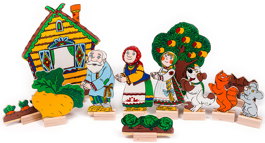 В состав настольного театра «Репка» входит 13 деталей: дед, бабка, внучка, собака, кот, мышка, репка, 2 забора, дерево, домик, 2 грядки с овощами и 13 подставок к ним. Расскажите и покажите своему малышу сказку «Репка», и вы увидите, как эмоционально отреагирует он на увиденное. И это не только театр, но и замечательный логопедический материал. Подрастая, ребенок будет сам разыгрывать сказку, развивая творческое мышление, речь (она становится образнее, выразительнее), обогащая словарный запас. Игра с настольным театром знакомит ребенка с народным творчеством, развивает навыки связной и логической речи, умение пересказывать. Сказка дает малышу первые представления о добре и зле, дружбе и предательстве, отваге и трусости. Именно сказки в доступной форме объясняют маленьким ребятам, что такое хорошо и плохо, закладывают моральные и социальные ценности. Сказка заставляет ребёнка сопереживать персонажам, в результате чего у него появляются не только новые знания, но и новое эмоциональное отношение к окружающему: к людям, предметам, явлениям.