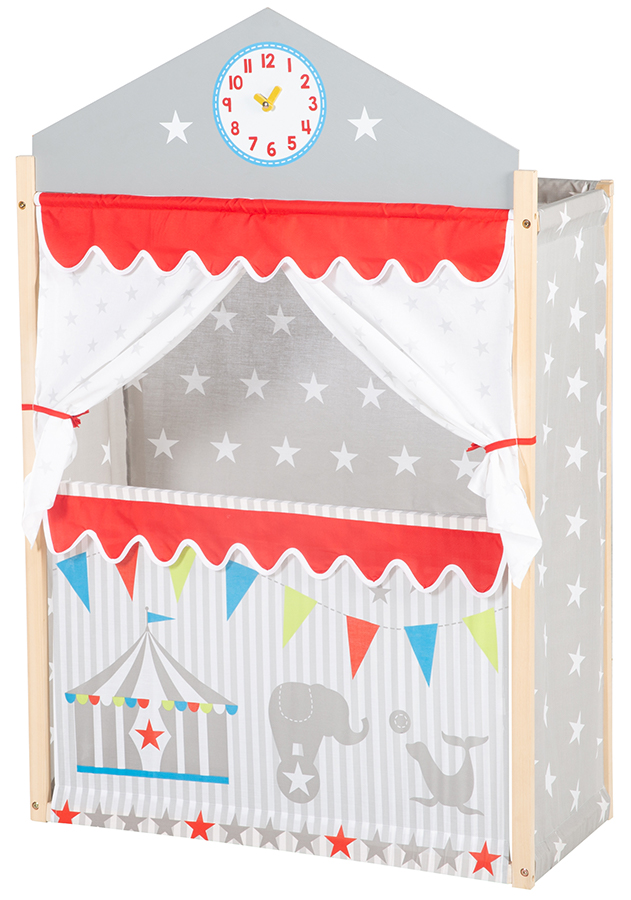 Детский театр развивает творческий потенциал и воображение детей. С большим игровым кукольным театром Roba сразу несколько детей могут одновременно разыгрывать маленькие пьесы и вживаться в новые роли. Красочный и яркий театр оснащен занавесками и часами с подвижными стрелками, обеспечит максимум веселья и "пунктуальность" выступлений в детской комнате. Текстильные декорации с веселым принтом в виде цирковых мотивов превратят игру в красочное шоу. Все материалы, используемые для кукольного, прошли испытания и сертифицированы. Немецкая компания Roba гарантирует отсутствие вредных веществ, водостойкость покрытий и безопасность всей своей продукции. Игровой театр был разработан в Германии в соответствии с европейским стандартом безопасности игрушек EN 71-1:2014. Подходит для детей в возрасте от 3 лет. Высота театра 129 см, ширина 84 см и глубина 39 см. Вес: 2.98 кг Наборы перчаточных кукол Roba арт. 9711 и 9713 станут прекрасным дополнением к театру. Основной материал: массив дерева Дополнительный материал: МДФ (лакированный) Текстиль можно стирать в машине.