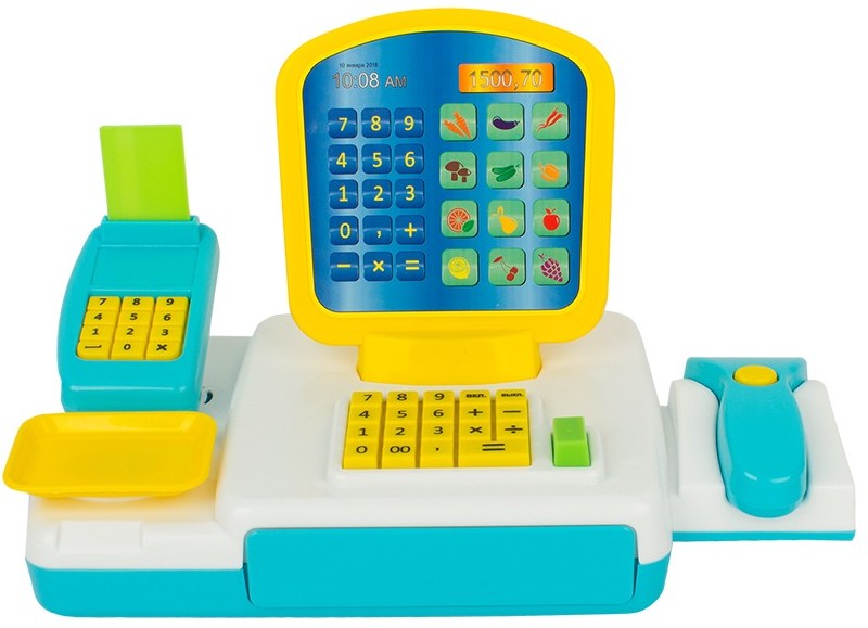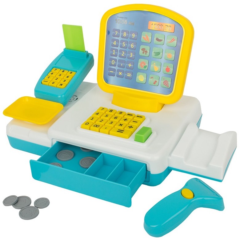 Кассовый аппарат с выдвижным лотком для купюр и монет, весами для взвешивания покупок, ручным сканером штрих-кода - отличный вариант расширить сюжетно-ролевую игру в магазин