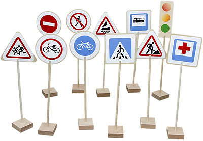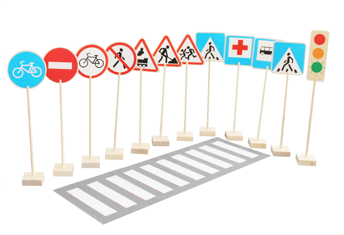 - дорожные знаки: велосипедная дорожка; осторожно, дети; железнодорожный переезд; пешеходный переход; пункт оказания медицинской помощи; остановка автобуса; дорожные работы; въезд запрещен; въезд на велосипеде запрещен; движения пешеходов запрещено
